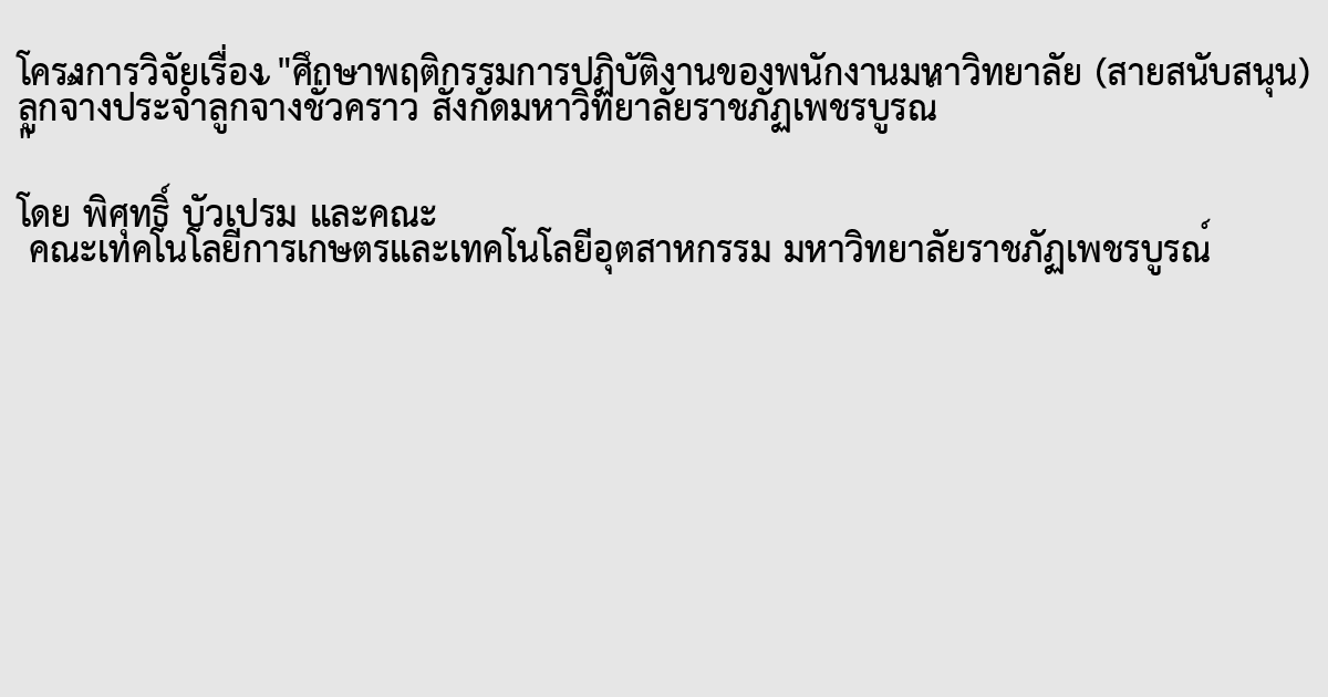 งานวิจัย ศึกษาพฤติกรรมการปฏิบัติงานของพนักงานมหาวิทยาลัย(สายสนับสนุน) ลูกจ้างประจํา และลูกจ้างชัวคราว สังกัดมหาวิทยาลัยราชภัฏเพชรบูรณ์ มีวัตถุประสงค์ สํารวจความ คิดเห็นของผู้บริหาร ข้าราชการ พนักงานมหาวิทยาลัย(สายวิชาการ) ผู้ปกครองและนักศึกษาต่อ พฤติกรรมการปฏิบัติงานของพนักงานมหาวิทยาลัย(สายสนับสนุน) ลูกจ้างประจํา และลูกจ้าง ชัวคราว และเพือสรุปข้อเสนอแนะการพัฒนาพฤติกรรมพนักงานมหาวิทยาลัย(สายสนับสนุน) ลูกจ้างประจํา และลูกจ้างชัวคราว ให้มีประสิทธิภาพเกิดประสิทธิผลต่อไป มีขอบเขตด้านประชากร ทีใช้ในการศึกษา ในครังนี คือ ผู้บริหารข้าราชการ พนักงานมหาวิทยาลัย (สายวิชาการ) ผู้ปกครอง และนักศึกษา มหาวิทยาลัยราชภัฏเพชรบูรณ์ มีการดําเนินการวิจัยเชิงสํารวจ โดยการตอบ แบบสอบถามความคิดเห็นของ ผู้บริหารข้าราชการ พนักงานมหาวิทยาลัย (สายวิชาการ) ผู้ปกครอง และนักศึกษาทีมีต่อพฤติกรรมการปฏิบัติงานของพนักงานมหาวิทยาลัย(สายสนับสนุ น) ลูกจ้างประจํา และลูกจ้างชัวคราว สังกัดมหาวิทยาลัยราชภัฏเพชรบูรณ์ทัง 2 ส่วน คือ ส่วนที พฤติกรรมการเป็ นพนักงานมหาวิทยาลัย(สายสนับสนุน) ลูกจ้างประจํา และลูกจ้างชัวคราวทีดี ตาม ข้อบังคับว่าด้วยจรรยาบรรณคณาจารย์และบุคลากรของมหาวิทยาลัยราชภัฏเพชรบูรณ์ และ ส่วนที พฤติกรรมเบียงเบนในการปฏิบัติราชการ (ข) จากผลสรุปการวิจัยพบว่าจากประเด็นความคิดเห็นของผู้บริหาร ข้าราชการ พนักงาน มหาวิทยาลัย (สายวิชาการ) ผู้ปกครองและนักศึกษาทีมีต่อพนักงานมหาวิทยาลัย(สายสนับสนุน) ลูกจ้างประจํา และลูกจ้างชัวคราว สังกัดมหาวิทยาลัยราชภัฏเพชรบูรณ์โดยมีรายละเอียด ทัง 2 ส่วน ดังนีส่วนที พฤติกรรมการเป็ นพนักงานมหาวิทยาลัย(สายสนับสนุน) ลูกจ้างประจํา และ ลูกจ้างชัวคราวทีดี ตามข้อบังคับว่าด้วยจรรยาบรรณคณาจารย์และบุคลากรของมหาวิทยาลัยราชภัฏ เพชรบูรณ์ รายด้าน จํานวน 10ด้าน ได้แก่ ) จรรยาบรรณต่อตนเอง 2) จรรยาบรรณต่อ วิชาชีพ 3) จรรยาบรรณต่อการปฏิบัติงาน 4) จรรยาบรรณต่อหน่วยงาน 5)จรรยาบรรณต่อ ผู้บังคับบัญชา 6)จรรยาบรรณต่อผู้ใต้บังคับบัญชา 7)จรรยาบรรณต่อผู้ร่วมงาน 8)จรรยาบรรณต่อ นักศึกษาและผู้รับบริการ 9)จรรยาบรรณต่อประชาชน 10)จรรยาบรรณต่อสังคม โดยรวมอยู่ใน ระดับมาก รายการพฤติกรรมการเป็ นพนักงานมหาวิทยาลัย(สายสนับสนุน) ลูกจ้างประจํา และลูกจ้างชัวคราวทีดีคือ ด้านจรรยาบรรณต่อผู้บังคับบัญชา มีค่าเฉลียรวมเท่ากับ .32 ส่วนที2 พฤติกรรมเบียงเบนในการปฏิบัติราชการ ใน กลุ่มพฤติกรรม ของพนักงานมหาวิทยาลัย (สายสนับสนุน) ลูกจ้าง