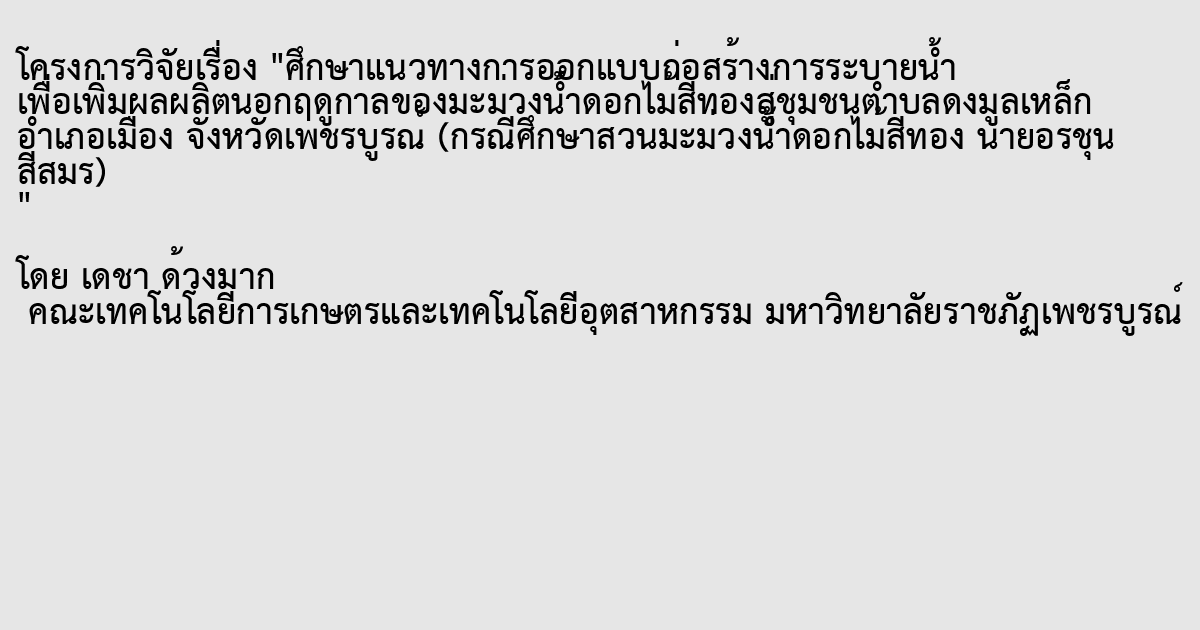 ศึกษาแนวทางการออกแบบก่อสร้างการระบายน้ำ เพื่อเพิ่มผลผลิตนอกฤดูกาลของมะม่วงน้ำดอกไม้สีทองสู่ชุมชนตำบลดงมูลเหล็ก อำเภอเมือง จังหวัดเพชรบูรณ์ (กรณีศึกษาสวนมะม่วงน้ำดอกไม้สีทอง นายอรชุน สีสมร)