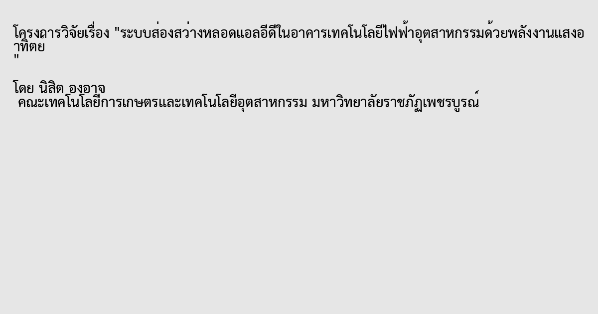 ดงัน้นั ระบบส่องสว่างหลอดแอลอีดีในอาคารเทคโนโลยีไฟฟ้ าอุตสาหกรรมด้วยพลังงาน แสงอาทิตย์โดยใช้หลอดแอลอีดีสามารถท างานได้ตามขอบเขตของการศึกษาค้นคว้ามีความ ปลอดภยัต่อผใู้ชง้านและสามารถนา ไปใชง้านในระบบส่องสวา่ งหลอดแอลอีดีตามอาคารอื่นๆได้
