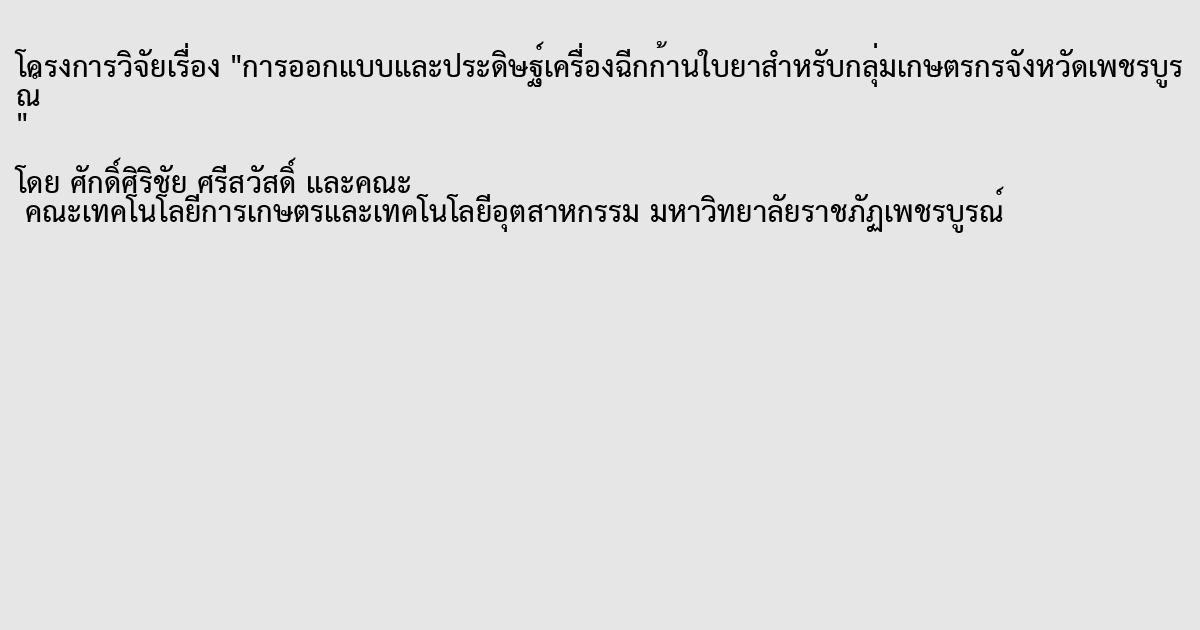 The purposes of this research were 1) to study the physical characteristics of the tobacco leaf for the machine design templates, 2) to design and test a performance of the machine to shred the leaf stalk, 3) to evaluate of user reviews for the machine to shred the tobacco leaf stalk, and 4) to convey the knowledge and technology of the machine to shred the tobacco leaf stalk to the community. For research methodology are divided into 4 phases, the population and sample from a random sample method for specific. In phase 1 the tobacco varieties included 700 Valley Gerber blade. Phase 2 was 5 expert involved in the tear-shaped tobacco leaves. Phase 3 was the tobacco growers about 32 people of style shred tobacco leaf stalk in Amphoe Lom Kao, Phetchabun province and phase 4 was a group of tobacco grower in Phetchabun province not less than 30 people. The results of this study were as follows: 1) The physical characteristics of tobacco leaf size were average width 436.05 mm, average length 447.51 mm , size of leaf stalk the foot lever average 13.16 mm, the rod end of area of tobacco leaf 5.05 mm and the length of the petiole that remains average 217.52 mm. 2) The design of the invention found that the comments are agree. The performance of this machine can shred tobacco leaf stalk average 100 leaves of 7.31 min. 3) The physical characteristics of tobacco leafs after shred with these machine looks available 99.86% , evaluation reviews the user's machine to shred the leaves with these machine the comments are agree. And 4) The result of the transfer of knowledge and technology to the community with training demonstrations with comments in the especially satisfying to own a torn leaf tobacco with the highest average.