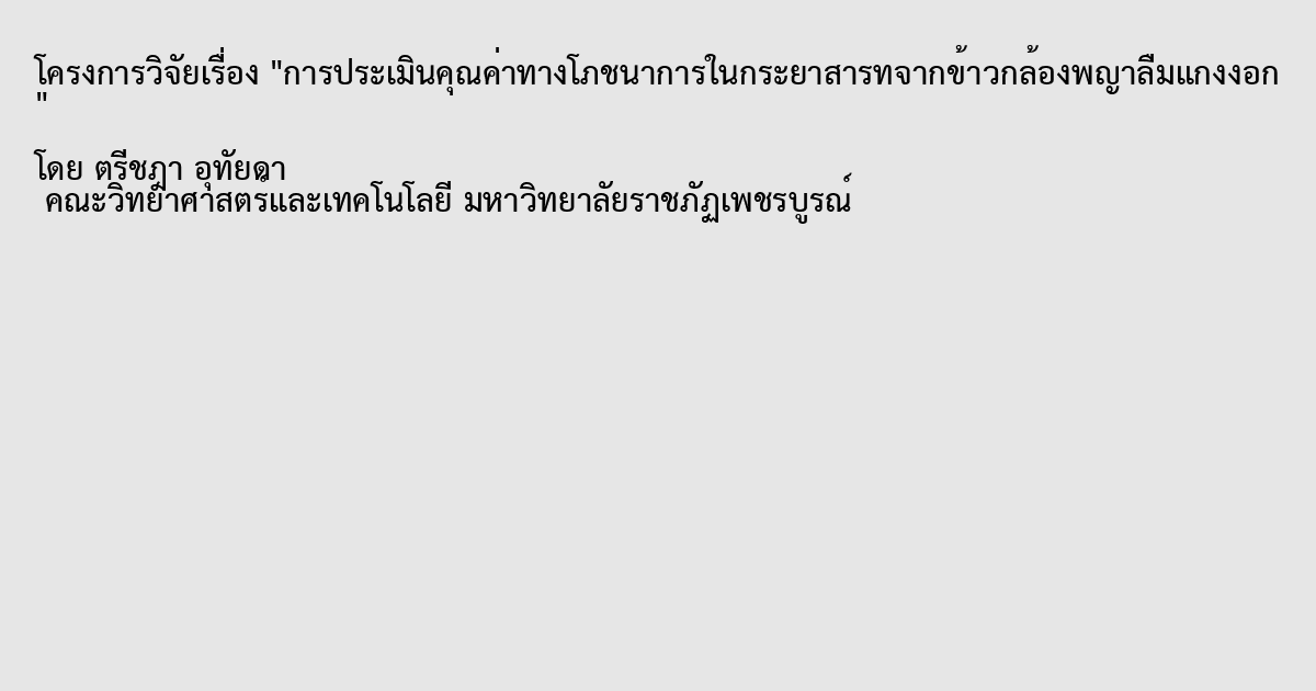 ผลของชนิดข้าวพญาลืมแกงต่อคุณค่าทางโภชนาการของกระยาสารท โดยศึกษาการน า ข้าวพญาลืมแกงชนิดต่างๆ ได้แก่ ข้าวขาว ข้าวกล้อง และข้าวกล้องงอกมาผลิตข้าวพองเพื่อเป็ น ส่วนผสมในกระยาสารท วิเคราะห์ปริมาณสารอาหาร สารกาบา และประเมินคุณภาพทางประสาท สัมผัส พบว่า กระยาสารทจากข้าวพญาลืมแกงมีส่วนผสม ได้แก่ ข้าวพองร้อยละ 40.82 ข้าวตอก ร้อยละ 13.61 ถวั่ ลิสงควั่ ร้อยละ4.53 งาขาวควั่ ร้อยละ4.53 น้า ผ้งึร้อยละ27.21 กลูโคสไซรัปร้อยละ 9.07 และเกลือร้อยละ 0.23 ปริมาณสารอาหารของข้าวกล้องพญาลืมแกงงอกมีปริมาณโปรตีนสูง (ร้อยละ 8.71) ปริมาณความช้ืน เถา้ ไขมนั เส้นใย และคาร์โบไฮเดรตมีความแตกต่างกันอย่างมี นัยส าคัญทางสถิติ (p ≤ 0.05) มีปริมาณสารกาบามากที่สุดเมื่อเทียบกับวัตถุดิบชนิดอื่น (p ≤ 0.05) (1.04มิลลิกรัมต่อตัวอย่าง 1กรัมน้า หนักแห้ง) และเมื่อน าข้าวพญาลืมแกงมาผ่านกระบวนการผลิต กระยาสารท พบว่า กระยาสารทจากข้าวกล้องพญาลืมแกงงอกมีปริมาณความช้ืน เถ้า ไขมัน เส้นใย โปรตีน และคาร์โบไฮเดรตเท่ากับ ร้อยละ 5.71, 1.26, 0.04, 2.68, 7.20 และ 83.12 ตามล าดับ สารกาบามีปริมาณลดลงโดยสูญเสียระหว่างกระบวนการผลิตคิดเป็ นร้อยละ 81.15 นอกจากน้ี ผลการประเมินคุณภาพทางประสาทสัมผัสโดยผู้ทดสอบจ านวน 50คน ใช้แบบทดสอบความชอบ 5 ระดับ พบว่าผบู้ริโภคให้การยอมรับคุณลกั ษณะดา้นสีกลิ่น รสชาติและความชอบโดยรวมของ กระยาสารทจากขา้วพญาลืมแกงท้ัง 3 ชนิดไม่มีความแตกต่างกันอย่างมีนัยส าคัญทางสถิติ (p> 0.05) โดยที่ผู้บริโภคมีความชอบโดยรวมต่อกระยาสารทจากข้าวกล้องพญาลืมแกงงอกอยู่ใน ระดับเฉยๆ