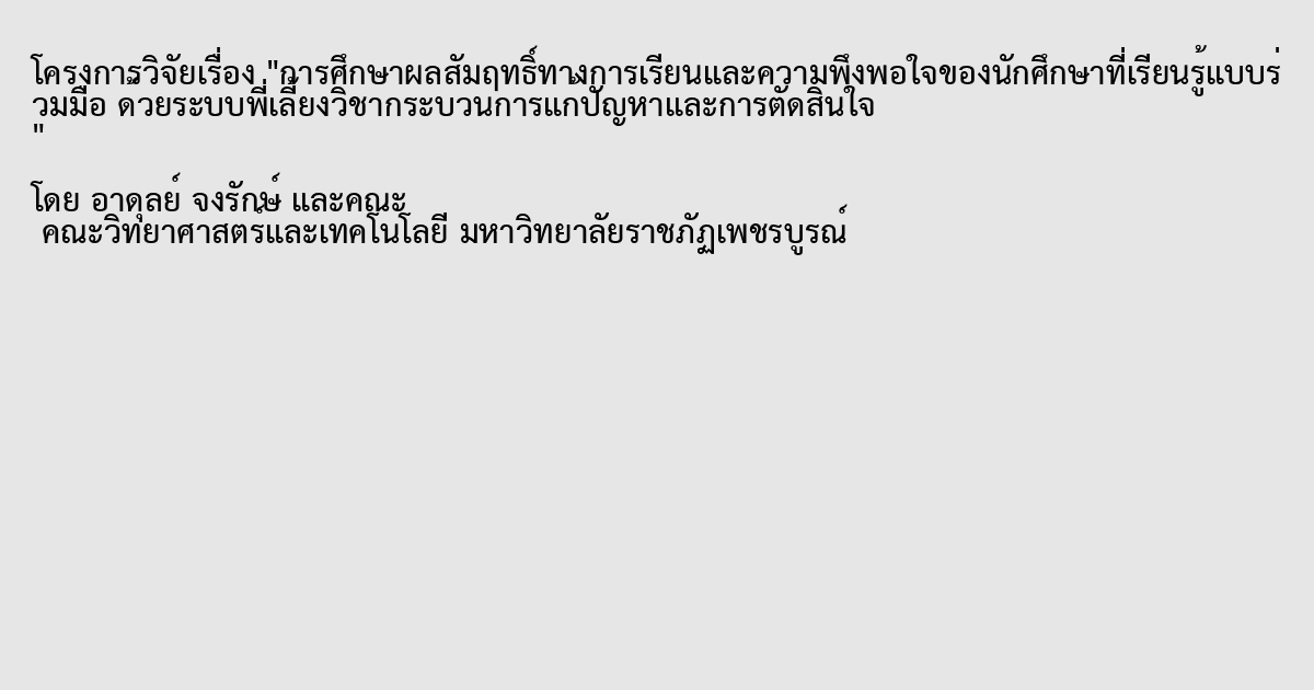งานวิจัยนี้มีวัตถุประสงค์เพื่อ 1) ศึกษาระดับความสามารถในการแก้ปัญหา 2) ศึกษาความพึงพอใจต่อการจัดการเรียนรู้ และ 3) ศึกษาผลสัมฤทธิ์ทางการเรียน ก่อนเรียนและหลังเรียน จากการจัดการเรียนรู้แบบร่วมมือ ด้วยระบบพี่เลี้ยง ของรายวิชากระบวนการแก้ปัญหาและการตัดสินใจ กับนักศึกษากลุ่มตัวอย่างแบบเจาะจง ซึ่งเป็นนักศึกษาชั้นปีที่ 3 สาขาวิชาการตลาด และสาขาวิชาวิศวกรรมคอมพิวเตอร์ จำนวน 39 คน ทำการเก็บรวมรวมข้อมูลรูปแบบการเรียนรู้ ผลสำฤทธิ์ทางการเรียน ก่อนและหลังเรียน จากการใช้กิจกรรมการแก้ปัญหาท้าทาย จำนวน 3 สถานการณ์ ผลการทดลองพบว่า ผลการศึกษาศึกษาระดับความสามารถในการแก้ปัญหา ด้วยกระบวนการเรียนรู้แบบร่วมมือด้วยระบบพี่เลี้ยง ซึ่งคัดเลือกจากนักศึกษากลุ่มเก่งหน้าที่เป็นพี่เลี้ยงให้กับนักศึกษากลุ่มกลาง และกลุ่มอ่อน พบว่านักศึกษากลุ่มกลาง และกลุ่มอ่อนมีระดับความสามารถในการแก้ปัญหา โดยปรับเปลี่ยนกระบวนการเรียนรู้ ทั้งด้านความเข้าใจความหมายทางคณิตศาสตร์ ความสามารถในการคิดคำนวณและทักษะทางตัวเลข และการให้เหตุผลอย่างเป็นระบบในทิศทางที่ดีขึ้น ผลจากการศึกษาความพึงพอใจ ต่อการจัดการเรียนรู้แบบร่วมมือด้วยระบบพี่เลี้ยง พบว่าอยู่ในระดับมาก และผลสัมฤทธิ์ทางการเรียนทดสอบด้วยสถิติ t พบว่า ผลสัมฤทธิ์ทางการเรียนหลังเรียนสูงกว่าก่อนเรียนอย่างมีนัยสำคัญทางสถิติ .01