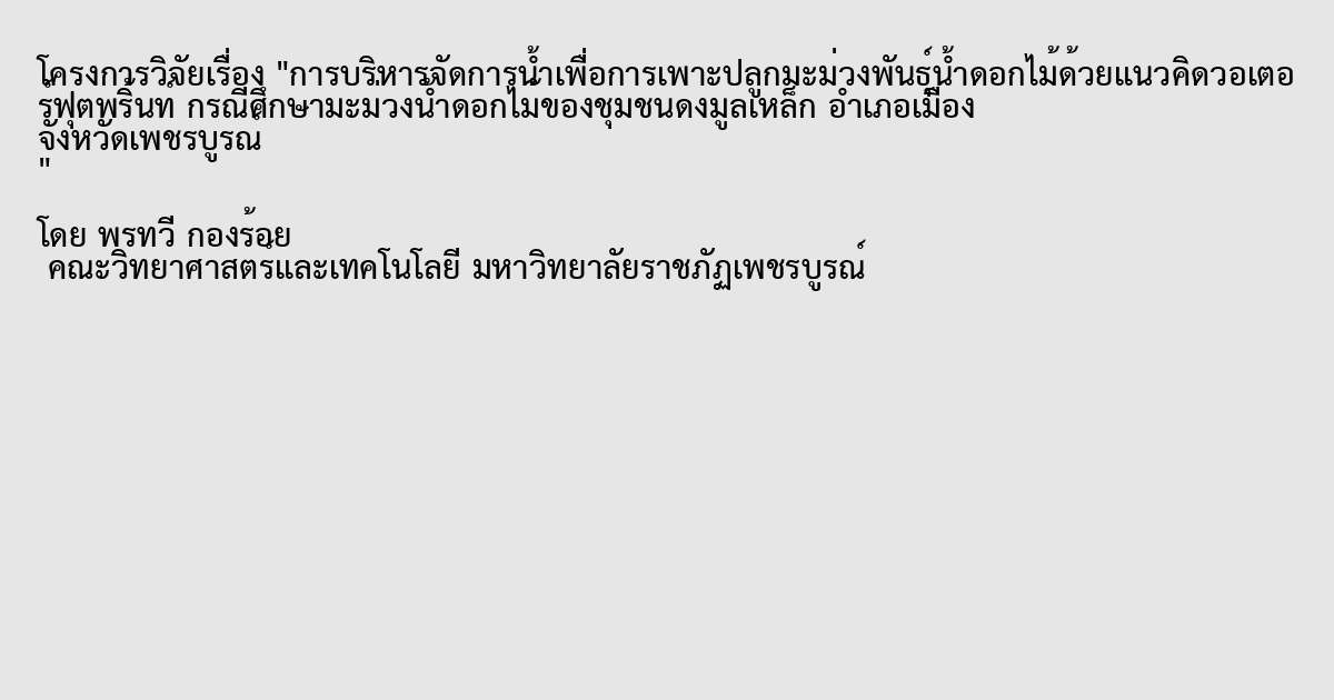 การประเมินวอเตอร์ฟุตพริ้นท์ของการปลูกมะม่วงน้ำดอกไม้ดำเนินการศึกษาครอบคลุมตลอดช่วงอายุการเจริญเติบโตของมะม่วงน้ำดอกไม้ โดยพิจารณา 3 ส่วน คือ 1. ปริมาณน้ำที่ต้นมะม่วงดูดซับและหมุนเวียนนำไปใช้จากน้ำฝนหรือความชื้นในดิน (Green Water Footprint) 2. ปริมาณน้ำที่ซึมลงสู่ใต้ดินและเก็บกักในแหล่งน้ำธรรมชาติ (Blue Water Footprint) และ 3. ปริมาณน้ำเสียที่เกิดจากกิจกรรมการปลูกมะม่วงน้ำดอกไม้ (Gray Water Footprint) จากการศึกษาพบว่าวอเตอร์ฟุตพริ้นท์จากการปลูกมะม่วงน้ำดอกไม้มีค่า 207 ลูกบาศก์เมตร/ตัน โดยคิดเป็นค่าวอเตอร์ฟุตพริ้นท์สีเขียว 40.3 ลูกบาศก์เมตร/ตัน สีน้ำเงิน 145.4 ลูกบาศก์เมตร/ตัน และสีเทา 21.3 ลูกบาศก์เมตร/ตัน ตามลำดับ ซึ่งเมื่อพิจารณาการใช้น้ำในแต่ละส่วนจะพบว่าน้ำที่ใช้ในการปลูกมะม่วงน้ำดอกไม้สีทองส่วนมากจะเป็นน้ำสีน้ำเงินหรือน้ำที่ได้จากแหล่งน้ำผิวดินและแหล่งน้ำใต้ดิน ส่วนของวอเตอร์ฟุตพริ้นท์สีเทาพิจารณาเพียงผลมลพิษจากปริมาณการใช้ปุ๋ยไนโตรเจนของเกษตรกรจึงแปรผันโดยตรงกับปริมาณการใช้ปุ๋ย ดังนั้น เกษตรกรควรลดปริมาณการใช้น้ำของมะม่วงน้ำดอกไม้และขยายพื้นที่ปลูกให้เหมาะสมกับปริมาณน้ำต้นทุนที่มีอยู่ รวมถึงส่งเสริมให้เกิดการพัฒนาด้านฉลากวอเตอร์ฟุตพริ้นท์ (WF) ของผลิตภัณฑ์เกษตร เพื่อสร้างความตระหนักในภาคการบริโภคและให้เกิดความยั่งยืนด้านการใช้น้ำในอนาคต สำหรับการประเมินระดับความตึงเครียดด้านน้ำจากการปลูกมะม่วงน้ำดอกไม้ในพื้นที่ตำบลดงมูลเหล็ก อำเภอเมือง จังหวัดเพชรบูรณ์ พบว่า มีค่า WSI เท่ากับ 0.0106 ซึ่งมีค่าน้อยกว่า