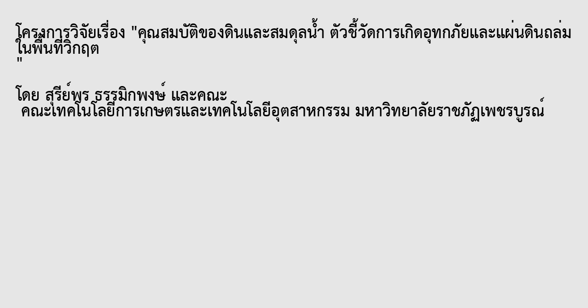 วัตถุประสงค์ของการวิจัย ศึกษาปัจจัยที่เกี่ยวข้อง ประเมินหาพื้นที่เสี่ยงภัย และหามาตรการการจัดการการเกิดอุทกภัยและแผ่นดินถล่มในพื้นที่ลุ่มน้ำ จังหวัดเพชรบูรณ์ งานวิจัยนี้ได้ดำเนินการในพื้นที่ตำบลน้ำก้อซึ่ง มีลุ่มน้ำก้อเป็นพื้นที่หลักของอำเภอหล่มหลัก จังหวัดเพชรบูรณ์ โดยการประยุกต์ใช้ระบบสารสนเทศภูมิศาสตร์ กำหนดค่าน้ำหนักและความสามารถของปัจจัยแต่ละระดับ ได้แก่ ปริมาณน้ำฝน ความลาดชันของพื้นที่ อัตราการซึมซาบน้ำของดินการใช้ประโยชน์ที่ดิน เส้นทางคมนาคม ความสูงจากระดับน้ำทะเลปานกลาง และลักษณะชนิดหิน