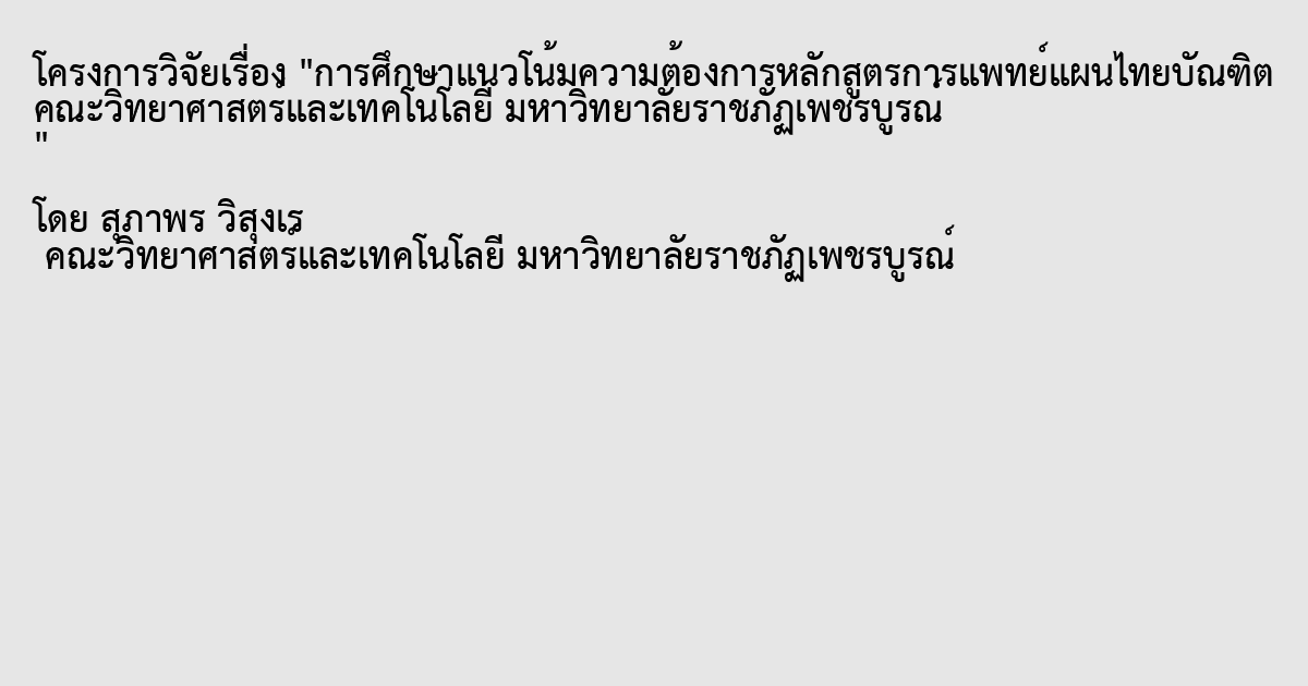 แนวโน้มความต้องการ,หลักสูตรการแพทย์แผนไทยบัณฑิต,คณะวิทยาศาสตร์และ เทคโนโลยี มหาวิทยาลัยราชภัฏเพชรบูรณ,Trends of Demand,Bachelor of Thai Traditional Medicine Program,Faculty of science and Technology,Phetchabun Rajabhat University