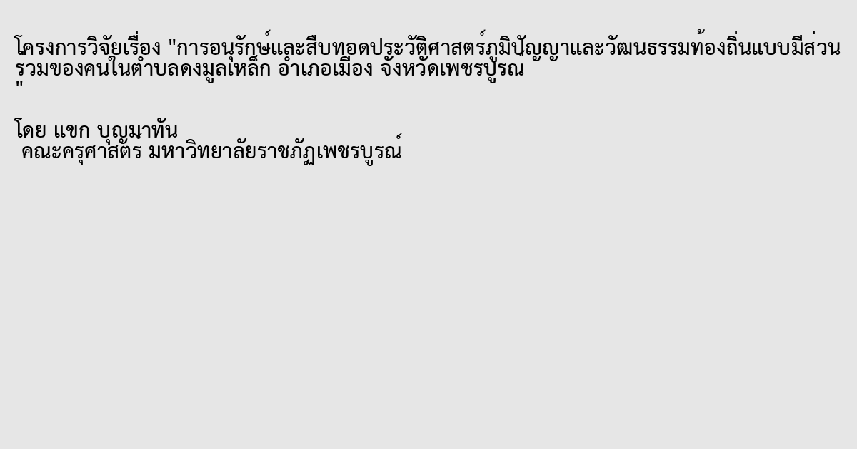 การอนุรักษ์และสืบทอดประวัติศาสตร์ ภูมิปัญญาและวัฒนธรรมท้องถิ่นแบบมีส่วนร่วมของคนในตำบลดงมูลเหล็ก อำเภอเมือง จังหวัดเพชรบูรณ์,การอนุรักษ์,การสืบทอด,ประวัติศาสตร์,ภูมิปัญญาท้องถิ่น,ภูมิปัญญา,วัฒนธรรมท้องถิ่น,ตำบลดงมูลเหล็ก