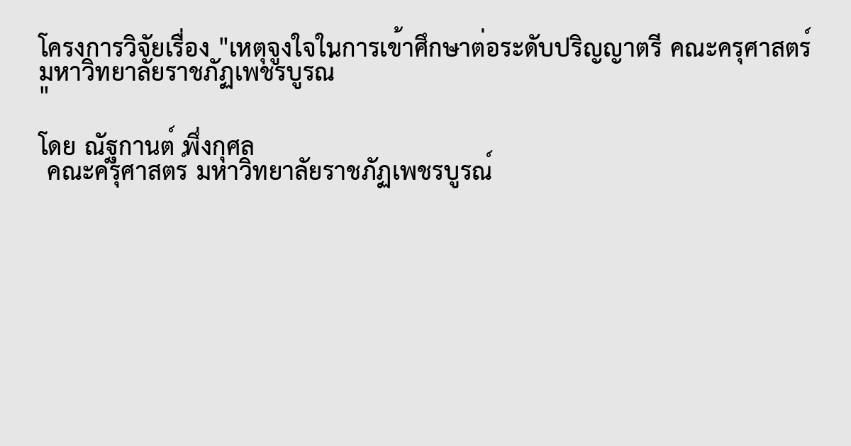 งานวิจัยเรื่องเหตุจูงใจในการเข้าศึกษาต่อระดับปริญญาตรี คณะครุศาสตร์ มหาวิทยาลัยราชภัฏเพชรบูรณ์ มีวัตถุประสงค์เพื่อ 1) เพื่อศึกษาเหตุจูงใจที่ทำให้นักศึกษาชั้นปีที่ 1 มหาวิทยาลัยราชภัฏเพชรบูรณ์ เข้าศึกษาในคณะครุศาสตร์ ในด้านความถนัด ด้านสภาพแวดล้อมทางกายภาพของสถานศึกษา ด้านวิชาการ ด้านสภาพเศรษฐกิจ และ ด้านบุคคลที่เกี่ยวข้อง 2) เพื่อเปรียบเทียบเหตุจูงใจในการเลือกศึกษา คณะครุศาสตร์ ของนักศึกษาชั้นปีที่ 1 มหาวิทยาลัยราชภัฏเพชรบูรณ์ จำแนกตามข้อมูลพื้นฐานของนักศึกษา ประชากรที่ใช้ในการวิจัยครั้งนี้เป็นนักศึกษาคณะครุศาสตร์ มหาวิทยาลัยราชภัฏเพชรบูรณ์ ชั้นปี ที่ 1 ปีการศึกษา 2557 จำนวน 344 คน โดยใช้วิธีการสุ่มตัวอย่างแบบแบ่งชั้นภูมิ (stratified random sampling) จำนวน 249 คน เครื่องมือที่ใช้ในการวิจัยใช้แบบสอบถาม สถิติที่ใช้ในการวิเคราะห์ข้อมูลคือค่าความถี่ ร้อยละ ค่าเฉลี่ย และส่วนเบี่ยงเบนมาตรฐาน ทดสอบสมมติฐานโดยใช้ t – test F-test และเปรียบเทียบพหุคูณ โดยใช้วิธี LSD ผลการวิจัยพบว่า : 1) เหตุจูงใจในการเข้าศึกษาต่อระดับปริญญาตรี คณะครุศาสตร์ มหาวิทยาลัยราชภัฏเพชรบูรณ์ โดยภาพรวมและรายด้านทั้ง 5 ด้าน อยู่ในระดับ มาก และเมื่อพิจารณารายด้านพบว่า ด้านสภาพแวดล้อมทางกายภาพของสถานศึกษา มีค่าเฉลี่ยสูงสุด รองลงมาคือด้านความถนัด ด้านวิชาการ ด้านสภาพเศรษฐกิจ และ ด้านบุคคลที่เกี่ยวข้อง ตามลำดับ 2) การเปรียบเทียบเหตุจูงใจในการเลือกศึกษา ต่อระดับปริญญาตรี คณะครุศาสตร์ มหาวิทยาลัยราชภัฏเพชรบูรณ์ จำแนกตามข้อมูลพื้นฐานของนักศึกษา พบว่า เพศ เกรดเฉลี่ยมัธยมศึกษาตอนปลาย อาชีพของบิดา อาชีพของมารดา ระดับการศึกษาของมารดา สถานภาพการสมรสของบิดามารดา และ จำนวนพี่น้องในครอบครัวเหตุจูงใจในการเลือกศึกษา คณะครุศาสตร์ ไม่แตกต่างกัน ทั้งภาพรวมและรายด้าน ส่วน สาขาวิชา ระดับการศึกษาของบิดา รายได้เฉลี่ยรวมต่อเดือนของครอบครัว และ การยื่นคะแนนการสอบแอดมิชชั่น เหตุจูงใจในการเลือกศึกษาคณะครุศาสตร์ แตกต่างกัน ที่ระดับนัยสำคัญ .05