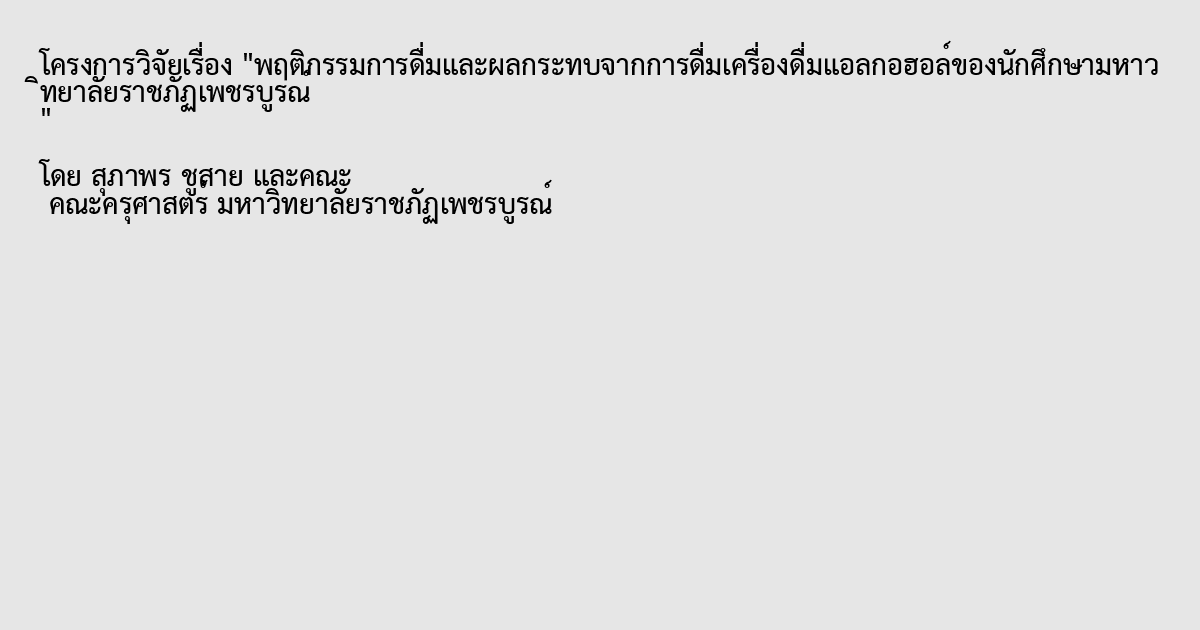 การศึกษาพฤติกรรมการดื่มเครื่องดื่มแอลกอฮอล์ และผลกระทบจากการดื่มเครื่องดื่มแอลกอฮอล์โดยใช้กลุ่มตัวอย่างจากนักศึกษามหาวิทยาลัยราชภัฏเพชรบูรณ์ทั้ง5คณะได้แก่ คณะครุศาสตร์ คณะวิทยาศาสตร์และเทคโนโลยี คณะเทคโนโลยีการเกษตร คณะวิทยาการจัดการ คณะมนุษยศาสตร์และสังคมศาสตร์ ภาคเรียนที่1ปีการศึกษา2558 โดยใช้วิธีการสุ่มตัวอย่างจำนวน379 คน ระยะเวลา 12เดือน