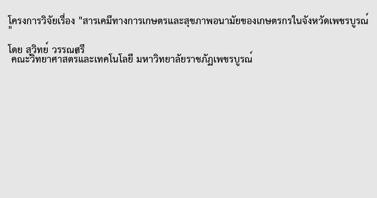 การวิจัยเรื่อง สารเคมีทางการเกษตรและสุขภาพอนามัยของเกษตรกรในจังหวัดเพชรบูรณ์ มีวัตถุประสงค์เพื่อศึกษา (1) ความตระหนักต่อสุขภาพ อนามัยและสิ่งแวดล้อมในการใช้สารเคมีทางการเกษตรของเกษตรกรในจังหวัดเพชรบูรณ์ (2) ความสัมพันธ์ระหว่างปัจจัยพื้นฐานส่วนบุคคล เศรษฐกิจและสังคมกับความตระหนักต่อสุขภาพและสิ่งแวดล้อม (3) ปัญหา อุปสรรค ข้อเสนอแนะและแนวทางการพัฒนาในการใช้สารเคมีทางการเกษตรที่มีผลต่อสุขภาพและสิ่งแวดล้อม ประชาการที่ใช้ในการศึกษา คือ เกษตรกรผู้เพาะปลูกข้าวและข้าวโพด ในจังหวัดเพชรบูรณ์ โดยสุ่มตัวอย่างแบบหลายขั้นตอน (multi – stage random sampling technique) ได้กลุ่มตัวอย่าง 324 ราย เก็บรวบรวมข้อมูล โดยใช้การสัมภาษณ์ของเกษตรกร วิเคราะห์ข้อมูลโดยใช้ค่าสถิติ คือ ค่าร้อยละ (percentage) ค่าเฉลี่ย (mean) ค่าต่ำสุด (minimum) ค่าสูงสุด (maximum) ค่าเบี่ยงเบนมาตรฐาน (standard deviation) และทดสอบสมมุติฐานโดยใช้การวิเคราะห์ถดถอยพหุ (multiple regression analysis)