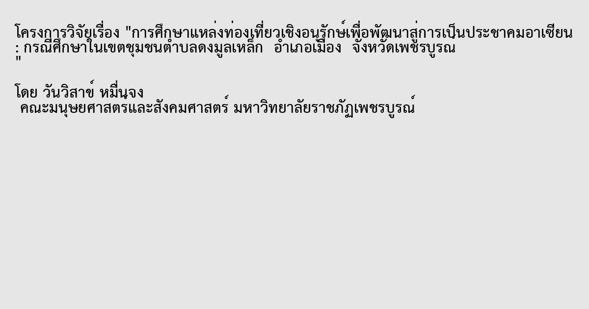 การศึกษาแหล่งท่องเที่ยวเชิงอนุรักษ์เพื่อพัฒนาสู่การเป็นประชาคมอาเซียน : กรณีศึกษาในเขตชุมชนตำบลดงมูลเหล็ก อำเภอเมือง จังหวัดเพชรบูรณ์