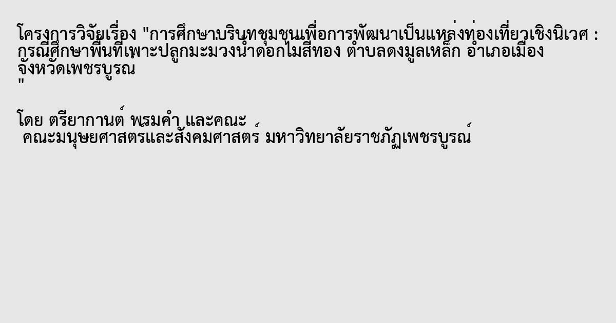 การวิจัยนี้มีวัตถุประสงค์เพื่อศึกษาแนวทางการพัฒนาแหล่งท่องเที่ยวเชิงนิเวศของพื้นพี่ เพาะปลูกมะม่วงน้้าดอกไม้สีทองในเขตต้าบลดงมูลเหล็ก โดยในการด้าเนินงานวิจัยผู้วิจัยได้เลือก ศึกษาจากกลุ่มเป้าหมายทั้งในระดับนโยบายและในระดับพื้นที่ ด้วยการสัมภาษณ์ผู้ที่เกี่ยวช้อง ได้แก่ นายกองค์การบริหารส่วนต้าบลดงมูลเหล็ก ผู้น้าชุมชนและประธานสมาคมชาวสวน และประชาชน ผู้ เพาะปลูกมะม่วงน้้าดอกไม้สีทอง เพื่อให้ได้ทราบถึงความต้องการอย่างแท้จริงและมีความสอดคล้อง กันในการพัฒนาเป็นแหล่งท่องเที่ยวเชิงนิเวศในเขตต้าบลดงมูลเหล็ก ผลการวิจัยพบว่า พื้นที่เพาะปลูกมะม่วงน้้าดอกไม้สีทองในเขตต้าบลดงมูลเหล็กที่ควรแก่ การพัฒนาเป็นแหล่งท่องเที่ยวเชิงนิเวศ คือ พื้นที่เพาะปลูกในหมู่ที่1 หมู่ที่2 หมู่ที่3 หมู่ที่4 หมู่ที่5 และ หมู่ที่8 ซึ่งมีความสอดคล้องกับความต้องการในการพัฒนาทั้งในระดับนโยบายและในระดับพื้นที่ เนื่องจากเป็นพื้นที่ที่มีการเพาะปลูกอยู่ก่อนแล้วจึงเหมาะแก่การด้าเนินการพัฒนาก่อนเพื่อจะได้เป็น ต้นแบบให้กับประชาชนในเขตพื้นที่ที่ยังไม่มีการเพาะปลูก ทั้งนี้แนวทางในการพัฒนาแหล่งท่องเที่ยว เชิงนิเวศได้มีการระบุไว้ในแผนพัฒนาขององค์การบริหารส่วนต้าบลดงมูลเหล็กจึงมีความสอดคล้องกับ ความต้องการในการพัฒนาพื้นที่เพาะปลูกมะม่วงน้้าดอกไม้สีทองให้เป็นแหล่งท่องเที่ยวเชิงนิเวศใน ระดับพื้นที่ด้วย และยังมีความสอดคล้องกับแนวทางการพัฒนาของทางจังหวัดเพชรบูรณ์ และแนวคิด ทฤษฎีความเป็นไปได้อีกด้วย ส้าหรับแนวทางการพัฒนาพื้นที่เพาะปลูกมะม่วงน้้าดอกไม้ให้เป็นแหล่ง ท่องเที่ยวเชิงนิเวศที่ควรด้าเนินการ ได้แก่ การปรับปรุงเส้นทางถนนที่ช้ารุด, การก้าหนดเส้นทางการ ท่องเที่ยวที่ชัดเจน, การสร้างศูนย์รวมการแนะน้านักท่องเที่ยว, การจัดท้าป้ายประชาสัมพันธ์พื้นที่ เพาะปลูก และการส่งเสริมจุดเด่นที่มีในแต่ละหมู่บ้านควบคู่ไปกับการประชาสัมพันธ์พื้นที่เพาะปลูก มะม่วงน้้าดอกไม้สีทอง เป็นส้าคัญ