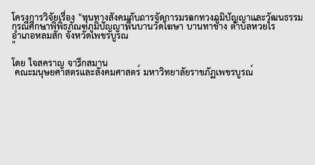 ทุนทางสังคมกับการจัดการมรดกทางภูมิปัญญาและวัฒนธรรม กรณีศึกษาพิพิธภัณฑ์ภูมิปัญญาพื้นบ้านวัดโฆษา บ้านท่าช้าง ตำบลห้วยไร่ อำเภอหล่มสัก จังหวัดเพชรบูรณ์