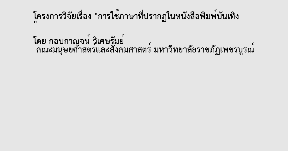 งานวิจัยนี ้ศึกษาเรื่อง “การใช้ภาษาที่ปรากฏในหนังสือพิมพ์บันเทิง” มีวัตถุประสงค์เพื่อศึกษา ภาษาที่ใช้ในการนําเสนอข่าวบันเทิง โดยใช้วิธีเก็บรวบรวมข้อมูลจากหนังสือพิมพ์บันเทิงระหว่างเดือน ธันวาคม ๒๕๕๗ –กุมภาพันธ์ ๒๕๕๘ ประกอบด้วย หนังสือพิมพ์สยามบันเทิง หนังสือพิมพ์สยามดารา หนังสือพิมพ์super บันเทิง และหนังสือพิมพ์ดาราเดลี่ และนํามาวิเคราะห์ลักษณะการใช้ภาษา ผลการวิจัยพบว่า การใช้ภาษาในหนังสือพิมพ์บันเทิงมีลักษณะต่าง ๆ ดังนี ้ 1) การใช้คําและ ประโยค ประกอบด้วย การใช้คําสแลง การใช้อักษรย่อ การใช้คําเพื่อแสดงจํานวนในลักษณะเดียวกับ ภาษาต่างประเทศ การใช้สมญานาม การใช้คําแสดงภาพพจน์ การเรียงคําลักษณนามไม่ถูกต้องตาม หลักภาษาไทย การใช้คําตัดสั ้น การใช้คําภาษาต่างประเทศ การใช้คําเลียนแบบเสียงพูด การใช้คํา ภาษาต่างประเทศร่วมกับคําภาษาไทย การใช้ภาษาพูด การใช้คําไม่สุภาพ การสะกดคําผิด การใช้ คําผิดความหมาย การละประธานของประโยค การใช้สํานวน และการใช้ตัวอักษรภาษาต่างประเทศ ร่วมกับตัวอักษรไทย 2) การใช้เครื่องหมายวรรคตอน ประกอบด้วย การใช้เครื่องหมายอัศเจรีย์ การใช้ เครื่องหมายอัญประกาศ การใช้เครื่องหมายยัติภาค และการใช้เครื่องหมายปรัศนี
