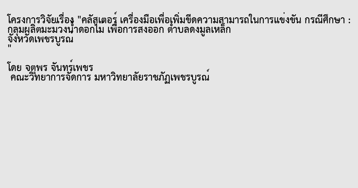 ชื่องานวิจัย คลัสเตอร์ เครื่องมือเพื่อการเพิ่มขีดความสามารถในการแข่งขัน กรณีศึกษา: กลุ่มผลิตมะม่วงน้ำดอกไม้เพื่อการส่งออก ตำบลดงมูลเหล็ก จังหวัดเพชรบูรณ์ ชื่อผู้วิจัย จตุพร จันทร์เพชร สาขาวิชา เศรษฐศาสตร์ ปีการศึกษา มหาวิทยาลัยราชภัฏเพชรบูรณ์ ปีเสร็จวิจัย 2558 บทคัดย่อ การศึกษาในครั้งนี้มีวัตถุประสงค์เพื่อ 1. เพื่อศึกษาถึงปัจจัยที่ใช้ในการส่งเสริมสนับสนุนและพัฒนากลุ่มคลัสเตอร์ และ 2. เพื่อศึกษาถึงการเพิ่มขีดความสามารถของการแข่งขันของธุรกิจจากการรวมกลุ่มเป็นคลัสเตอร์ โดยการศึกษาและเก็บรวบรวมข้อมูลโดยใช้แบบสอบถามจากเกษตรกรผู้ปลูกมะม่วงน้ำดอกไม้สีทอง ในเขตตำบลดงมูลเหล็ก อำเภอเมือง จังหวัดเพชรบูรณ์จำนวน 30 ครัวเรือน โดยใช้วิธีการวิเคราะห์ข้อมูลทางสถิติต่าง ๆ คือ ค่าร้อยละ(Percentage) ค่าความถี่ (Frequency) ค่าเฉลี่ย (Average) ส่วนเบี่ยงเบนมาตรฐาน (S.D.) ผลการศึกษาข้อมูลทั่วไป พบว่า กลุ่มผู้ปลูกมะม่วงน้ำดอกไม้มีพื้นที่เฉลี่ยอยู่ที่ 6-10 ไร่ พื้นที่ที่ใช้ปลูกมะม่วงน้ำดอกไม้ส่วนใหญ่เป็นพื้นที่ของตนเอง จำนวนมะม่วงน้ำดอกไม้ที่ให้ผลผลิตอยู่ที่ 5,001-7,000 กิโลกรัม / ไร่ มีเงินทุนในการดำเนินกิจการส่วนใหญ่เป็นเงินทุนส่วนตัว เกษตรได้รับการอบรมให้ความรู้จากหน่วยงานภาครัฐ แรงงานที่ใช้ในการเก็บเกี่ยวผลผลิตส่วนใหญ่เป็นแรงงานใน สำหรับการจัดการการผลิตมะม่วงน้ำดอกไม้สีทอง เกษตรกรทั้งหมด 100% เกษตรกรเก็บเกี่ยวเอง , จ้างเก็บ / ขายผลผลิตให้แก่ผู้ค้าส่งทั้งหมดและเกษตรเป็นสมาชิกกลุ่มผู้ปลูกมะม่วงน้ำดอกไม้สีทอง เป็นสมาชิก ผลการศึกษาปัจจัยที่ใช้ในการส่งเสริมสนับสนุนและพัฒนากลุ่มคลัสเตอร์ และผลการศึกษาถึงการเพิ่มขีดความสามารถของการแข่งขันของธุรกิจจากการรวมกลุ่มเป็นคลัสเตอร์ พบว่า ปัจจัยด้านการส่งเสริมการรวมกลุ่ม ก่อให้เกิดความเข้มแข็งทางธุรกิจ ด้านการสร้างโอกาสทางการตลาด ก่อให้เกิดการพัฒนาตลาดใหม่ๆ การจับคู่ทางธุรกิจก่อให้เกิดโอกาสการขยายตัวทางการลงทุนได้มากกว่าเดิมรวมทั้งการศึกษาดูงานและการออกบูธแสดงสินค้า ด้านการพัฒนาประสิทธิภาพการผลิต ภาพรวมของการผลิตดีขึ้นพอสมควร ด้านการสร้างความเชื่อมโยงระหว่างกลุ่มควรส่งเสริมในการสร้างความเชื่อมโยงระหว่างกลุ่มให้มากยิ่งขึ้น ด้านการส่งเสริมของภาครัฐได้รับประโยชน์มากจากการส่งเสริมของภาครัฐ ซึ่งจะดำเนินการส่งเสริมในลักษณะการสนับสนุนงบประมาณ ด้านการเพิ่มขีดความสามารถการแข่งขันการดำเนินกิจกรรมการส่งเสริมการรวมกลุ่มการสร้างโอกาสทางการตลาดการพัฒนาประสิทธิภ