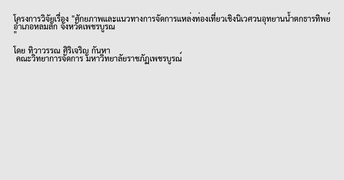 งานวิจัยนี้มีวัตถุประสงค์เพื่อ 1) ศึกษาศักยภาพการท่องเที่ยวเชิงนิเวศ 2) หาแนวทางการจัดการท่องเที่ยวเชิงนิเวศ ในพื้นที่วนอุทยานน้ำตกธารทิพย์ อำเภอหล่มสัก จังหวัดเพชรบูรณ์ วิธีการดำเนินการวิจัย ใช้กระบวนการวิจัยแบบมีส่วนร่วม โดยแบ่งขั้นตอนการดำเนินงานออกเป็น 2 ส่วน ประกอบด้วย 1)การเก็บข้อมูล ได้แก่ การเก็บข้อมูลด้านเอกสารและการเก็บข้อมูลภาคสนาม 2)การจัดการประชุมกลุ่มย่อย (focus group) และนำข้อมูลที่ได้มาประมวลผลและวิเคราะห์ข้อมูล กลุ่มตัวอย่างที่ใช้แบ่งออกเป็น 2 กลุ่ม ได้แก่ นักท่องเที่ยวชาวไทย จำนวน 400 คน และตัวแทนเจ้าหน้าที่หน่วยงานภาครัฐ ได้แก่ วนอุทยานน้ำตกธารทิพย์ จำนวน 3 คน และ สำนักงานท่องเที่ยวและกีฬาจังหวัดเพชรบูรณ์ จำนวน 2คน และองค์การบริหารส่วนตำบลบุ่งน้ำเต้า และตัวแทนชุมชนในพื้นที่ตำบลบุ่งน้ำเต้า จำนวน 15 คน รวม 20 คน สรุปผลการศึกษาพบว่า ระดับศักยภาพแหล่งท่องเที่ยวเชิงนิเวศ และพื้นที่โดยรอบแหล่งท่องเที่ยว ประกอบด้วยศักยภาพ 7 ด้าน ได้แก่ ด้านจุดดึงดูดการท่องเที่ยวในแหล่งท่องเที่ยวทางธรรมชาติและด้านกิจกรรมท่องเที่ยวเชิงนิเวศ ( = 4.11) ด้านการสร้างจิตสำนึกและการให้ความรู้( = 4.04) ด้านความปลอดภัยของนักท่องเที่ยว( = 3.87) ด้านความสะดวกสบายในการเข้าถึงแหล่งท่องเที่ยว( = 3.78) ด้านการมีส่วนร่วมของชุมชนท้องถิ่น ( = 3.60) และด้านสิ่งอำนวยความสะดวก ( = 3.48) โดยในภาพรวมมีศักยภาพอยู่ในระดับมาก ( = 3.87) โดยผู้วิจัยได้นำมาสรุปเป็นแนวทางการจัดการแหล่งท่องเที่ยวเชิงนิเวศ วนอุทยานน้ำตกธารทิพย์ ควรมีการจัดการด้านสิ่งอำนวยความสะดวก ด้านการเข้าถึงแหล่งท่องเที่ยว ด้านการมีส่วนร่วมของชุมชน และด้านการส่งเสริมและพัฒนาแหล่งท่องเที่ยวเชิงนิเวศโดยอาศัยปัจจัยภายนอก เช่น การส่งเสริมการตลาด และการใช้สื่อประชาสัมพันธ์