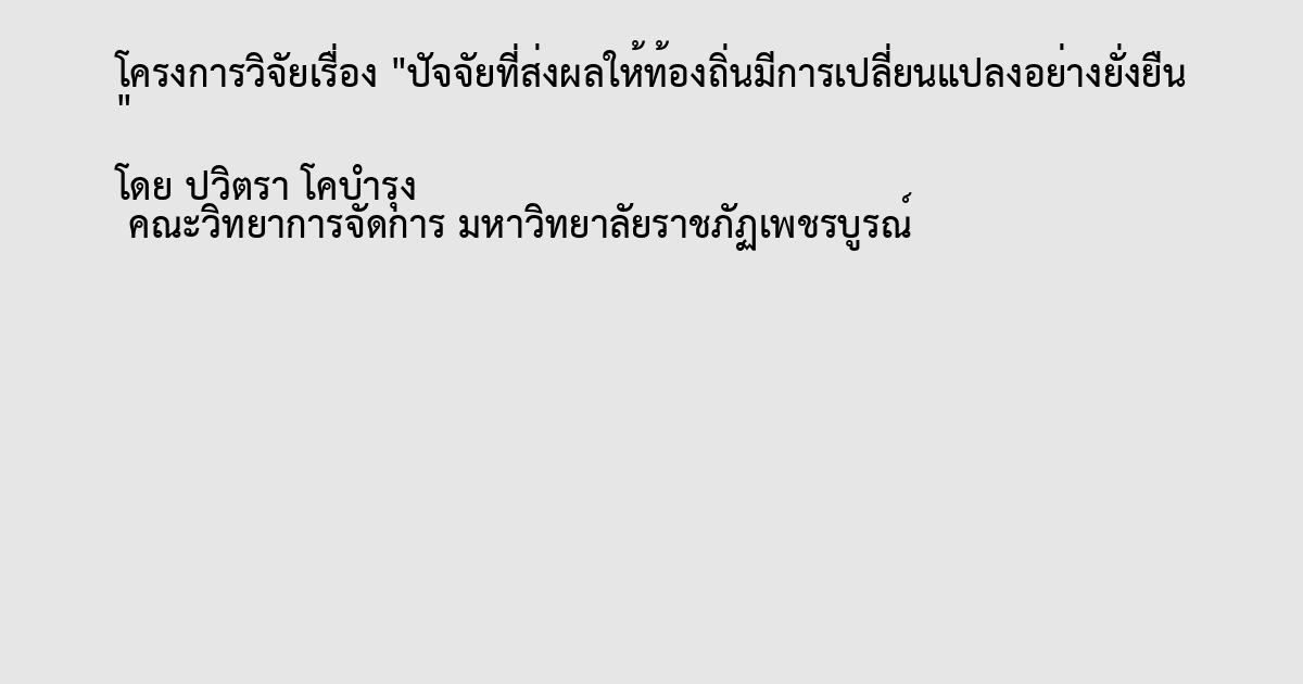งานวิจัยนี้ นำเสนอปัจจัยที่ส่งผลให้ท้องถิ่นมีการเปลี่ยนแปลงอย่างยั่งยืน โดยมีวัตถุประสงค์เพื่อศึกษาปัจจัยต่างๆที่ส่งผลให้ท้องถิ่นมีการเปลี่ยนแปลงอย่างยั่งยืน