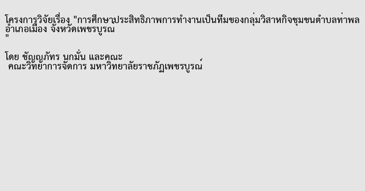 จากผลการวิจยัเรื่องการศึกษาประสิทธิภาพการทา งานเป็นทีมของกลุ่มวิสาหกิจชุมชน ตา บลท่าพลอา เภอเมือง จงัหวดัเพชรบูรณ์จา นวน 9กลุ่ม มีวตัถุประสงคเพื่อศึกษาประสิทธิภาพ ์ การทา งานเป็นทีมของบุคลากรกลุ่มวิสาหกิจชุมชนตา บลท่าพลอา เภอเมืองจงัหวดัเพชรบูรณ์ใน ดา้น ความรับผิดชอบต่องานที่ตอ้งปฏิบตัิความพึงพอใจในการปฏิบตัิงานกลุ่ม การพฒั นาตนเอง ในสายอาชีพ การสื่อสารภายในองคก์ ารและสภาพแวดลอ้ มภายในการทา งานโดยมีการสุ่มกลุ่ม ตวัอย่างที่ใช้ในการศึกษาจากกลุ่มวิสาหกิจชุมชนตา บลท่าพล อา เภอเมือง เพชรบูรณ์จา นวน 9 กลุ่ม คือวิสาหกิจชุมชนกลุ่มแม่บา้นวงัยาวร่วมใจ วิสาหกิจชุมชนกลุ่มตดั เย็บผา้บา้นดงเจริญ วสิาหกิจชุมชนกลุ่มน้า ดื่มธญั ญาพืชแม่บา้นท่าพล วสิาหกิจชุมชนกลุ่มส่งเสริมอาชีพการเล้ียงววั บ้านอมชีวิสาหกิจชุมชนกลุ่มเกษตรกรชีวภาพสารชีวภณั ฑ์ วิสาหกิจชุมชนกลุ่มผูป้ ลูกไม้ กฤษณา(ไมห้อม) วสิาหกิจชุมชนกลุ่มเกษตรอินทรียช์ีวภาพบา้นดงเจริญ วิสาหกิจชุมชนกลุ่มปุ๋ย นาขา้วพนั ธ์ดีบา้นดงเจริญ และวิสาหกิจชุมชนกลุ่มเกษตรกรกสิกรรมธรรมชาติท่าพลโดยใช้ เครื่องมือการวจิยัจากการสัมภาษณ์เชิงลึกกลุ่มเป้าหมายและการสุ่มกลุ่มเป้าหมายจา นวน 90คน โดยการใช้แบบสอบถามเพื่อประเมินประสิทธิภาพการทา งานกลุ่ม วสิาหกิจชุม ในดา้นความรับผดิชอบต่องานที่ตอ้งปฏิบตัิดา้นความพึงพอใจในการปฏิบตัิงานกลุ่ม การพัฒนาตนเองในสายอาชีพ การสื่อสารภายในองค์กร และสภาพแวดล้อมในการท างานเป็ น แบบสอบถามที่ผวู้จิยัสร้างข้ึน ผลการวิจยัสรุปว่าประสิทธิภาพการทา งานเป็นทีมของกลุ่มวิสาหกิจชุมชน ตา บลท่าพล อ าเภอเมือง จงัหวดัเพชรบูรณ์พบว่าสมาชิกของกลุ่มวิสาหกิจชุมชนตา บลท่าพลท้งั 9 กลุ่ม มี จุดเด่นในดา้นความพึงพอใจในการปฏิบตัิงานกลุ่ม สมาชิกในกลุ่มมีความภาคภูมิใจกบัผลงานที่ ได้ปฏิบตัิอย่างชดั เจนสามารถทา งานให้ส าเร็จได้ภายใตค้วามกดดนั ในการทา งานหนกัอย่างมี ประสิทธิภาพ มีความเป็นอิสระในการคิดและตดั สินใจแก้ไขปัญหาที่เกิดจากงานและเพื่อน ร่วมงานมีการช่วยแกไ้ขปัญหาในการปฏิบตัิงานไดท้ นั ท่วงทีซ่ึงการสื่อสารภายในกลุ่มสมาชิก และเพื่อนร่วมงานจะปรึกษาหารือกนัอยา่ งเปิดใจและหาแนวทางแกไ้ขปัญหามากกวา่ จะโทษกนั และกนัและมีบรรยากาศในการทา งานที่มีความเป็นกนั เองเป็นการทา งานแบบพี่แบบนอ้งของผนู้ า กลุ่ม จุดอ่อนของประสิทธิภาพของการทา งานเป็นทีมของกลุ่มวิสาหกิจชุมชนตา บลท่าพลจะไม่ มีประสิทธิภาพสามารถใชค้วามคิดสร้างสรรคเ์พื่อตดัสินใจ