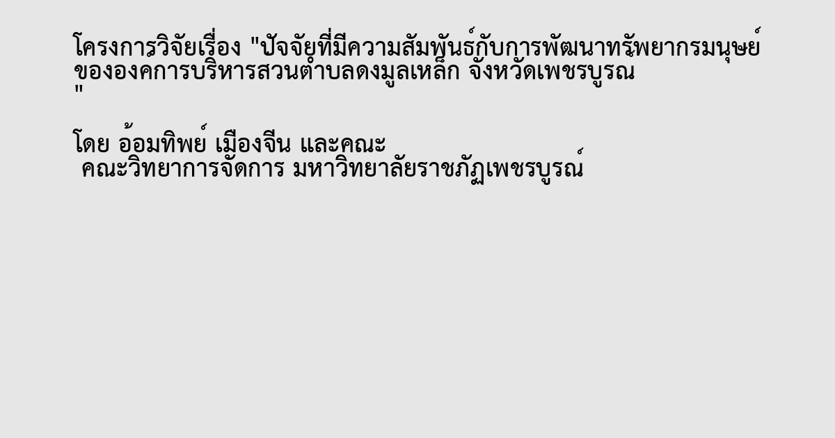 การศึกษาวิจัยครั*งนี* มีวัตถุประสงค์เพื1อ 1) ศึกษาปัจจัยที1มีผลต่อการพัฒนาทรัพยากรมนุษย์ ขององค์การบริหารส่วนตําบลดงมูลเหล็ก จังหวัดเพชรบูรณ์ 2) ศึกษาประสิทธิผลการพัฒนา ทรัพยากรมนุษย์ขององค์การบริหารส่วนตําบลดงมูลเหล็ก 3) เพื1อศึกษาความสัมพันธ์ระหวางปัจจัย ่ ที1มีผลต่อการพัฒนาทรัพยากรมนุษย์กบประสิทธิผลการพัฒนาทรัพยากรมนุษย์ขององค์การบริหาร ั ส่วนตําบลดงมูลเหล็กจังหวัดเพชรบูรณ์ 4) เพื1อเปรียบเทียบประสิทธิผลการพัฒนาทรัพยากรมนุษย์ ขององค์การบริหารส่วนตําบลดงมูลเหล็ก จังหวัดเพชรบูรณ์จําแนกตามปัจจัยส่วนบุคคล กลุ่ม ตัวอย่างจํานวน 90 คนเป็ นพนักงานองค์การบริ หารส่วนตําบลดงมูลเหล็ก จังหวัดเพชรบูรณ์ เครื1องมือที1ใช้ในการวิจัย คือ แบบสอบถามความคิดเห็นเกี1 ยวกบการพัฒนาทรัพยากรมนุษย์ของ ั องค์การบริหารส่วนตําบลดงมูลเหล็ก จังหวัดเพชรบูรณ์ วิเคราะห์ข้อมูลใช้ค่าร้อยละ ค่าเฉลี1ย และ ค่าเบี1ยงเบนมาตรฐาน สถิติค่าเพียร์สันใช้สําหรับวิเคราะห์ความสัมพันธ์ระหวางปัจจัยในการพัฒนา ่ ทรัพยากรมนุษย์กบประสิทธิผลการพัฒนาทรัพยากรมนุษย์ ั ผลการวิจัยพบวา ่ 1. ปัจจัยที1มีผลต่อการพัฒนาทรัพยากรมนุษย์ขององค์การบริหารส่วนตําบลดงมูลเหล็ก จังหวัดเพชรบูรณ์ โดยรวมอยู่ในระดับมาก เรียงตามลําดับความสําคัญจากมากไปน้อย คือ ด้าน ความรับผิดชอบของพนักงาน ด้านความรับผิดชอบในหน่วยงานบริหารทรัพยากรมนุษย์ ด้านความ รับผิดชอบของผู้บริ หารระดับสูง ด้านความรับผิดชอบของผู้บังคับบัญชาในสายงาน และด้าน นโยบายของหน่วยงาน 2. ประสิทธิผลการพัฒนาทรัพยากรมนุษย์ขององค์การบริหารส่วนตําบลดงมูลเหล็ก จังหวัด เพชรบูรณ์ โดยรวมอยูในระดับมาก เรียงตามลําดับความสําคัญจากมากไปน้อย คือ ่ ด้านพฤติกรรม ด้านความรู้ และด้านความสามารถ 3. ความสัมพันธ์ระหว่างปัจจัยที1มีผลต่อการพัฒนาทรัพยากรมนุษย์กบประสิทธิผลการ ั พัฒนาทรัพยากรมนุษย์ขององค์การบริหารส่วนตําบลดงมูลเหล็ก จังหวัดเพชรบูรณ์ โดยรวมพบวา่ มีความสัมพันธ์ระดับปานกลางทางบวก อยางมีนัยสําคัญทางสถิติที1ระดับ 0.01 ่ 4. การเปรียบเทียบประสิทธิผลการพัฒนาทรัพยากรมนุษย์ขององค์การบริหารส่วนตําบลดง มูลเหล็ก จังหวัดเพชรบูรณ์ พบว่า บุคลากรที1มีเพศ ระยะเวลาในการปฏิบัติงาน รายได้ต่อเดือน ต่างกน มีประสิทธิผลการพัฒนาทรัพยากรมนุษย์โดยรวมแตกต ั ่างกนนอย ั ่างมีนัยสําคัญทางสถิติที1 ระดับ 0.05 ส่วนบุคลากรที1มีอายุ สถานภาพ ระดับการศึกษา ประเภทตําแหน่งต่างกน มีประสิทธิผล ั การพัฒนาทรัพยากรมนุษย์ไม่แตกต่างกน ที1ระดับ