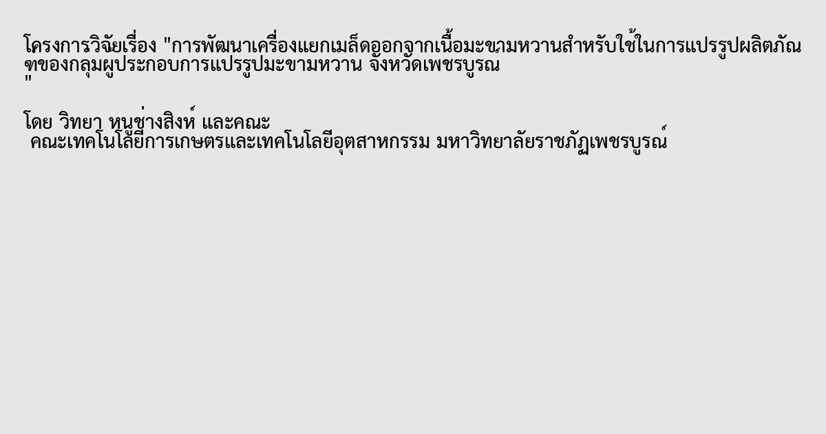 การพัฒนาเครื่องแยกเมล็ดออกจากเนื้อมะขามหวานสำหรับใช้ในการแปรรูปผลิตภัณฑ์ของกลุ่มผู้ประกอบการแปรรูปมะขามหวาน จังหวัดเพชรบูรณ์