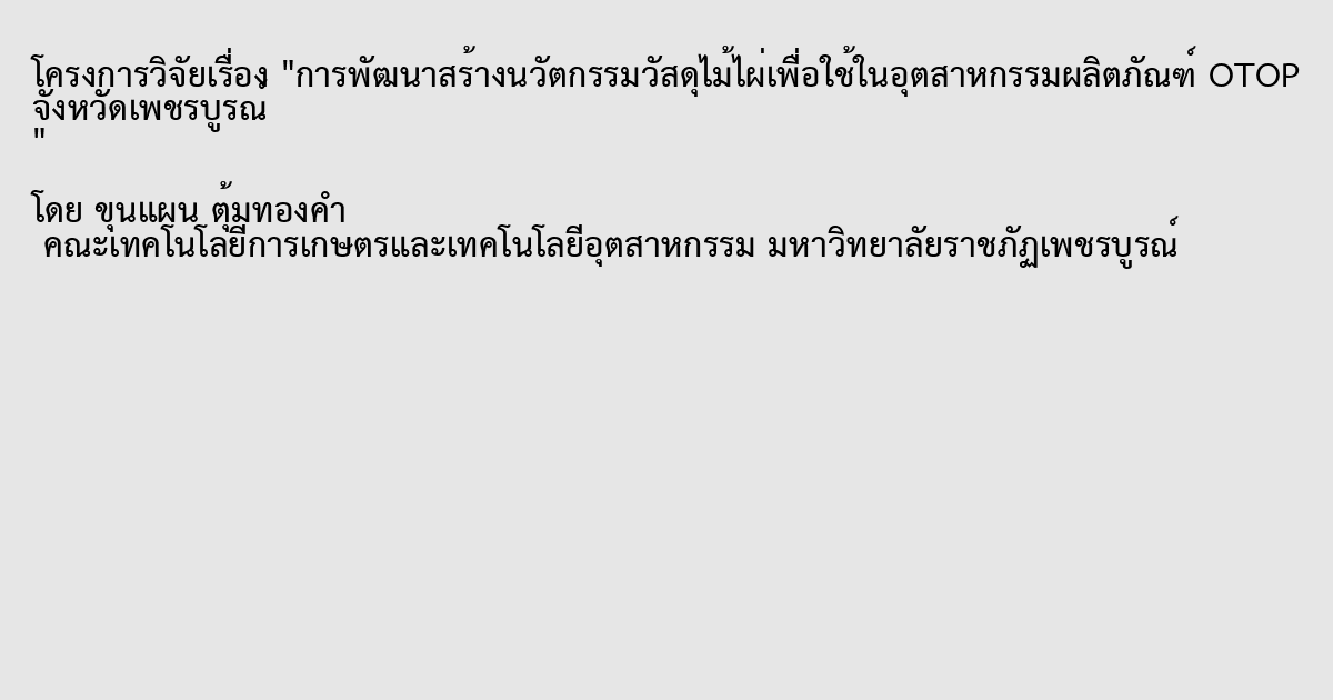 การวิจัยครั้งนี้มีจุดประสงค์เพื่อสร้างวัสดุไม้ไผ่ใช้ในอุตสาหกรรม OTOP จังหวัดเพชรบูรณ์และหาประสิทธิภาพวัสดุไม้ไผ่ตามเกณฑ์มาตรฐานผลิตภัณฑ์อุตสาหกรรม มอก. 966-2547 ดำเนินการวิจัยโดยศึกษาแนวทางการสร้างวัสดุไม้ไผ่ นำเทคโนโลยีมาผนวกเข้ากับวัสดุเหลือใช้ทางอุตสาหกรรม OTOP เตรียมการทดลองโดยการเลือกเศษไม้ไผ่ที่เหลือจากขบวนการผลิตมีขนาดความหนามากกว่า 10 มิลลิเมตรความยาว 300 มิลลิเมตร นำชิ้นไม้ไผ่ที่ได้ทำการคัดผิวอัดประสาน เป็นแผ่นไม้ประกอบโดยมีขนาด ยาว 300 มิลิเมตร กว้างขนาด 150 มิลิเมตร หนา 10 มิลลิเมตร ใช้กาวพอลิไวนิลแอซีเตต (Polyvinyl acetate) ในปริมาณร้อยละ 5 แรงอัด 5 กิโลกรัมต่อตารางเซนติเมตร อุณหภูมิ 70 องศาเซลเซียส และนำมาผึ่งกระแสอากาศเพื่อปรับสภาวะความชื้นและอุณหภูมิ 24 ชั่วโมง ออกแบบและพัฒนาสร้างต้นแบบผลิตภัณฑ์ไม้ไผ่จากแผ่นไม้ประกอบ 10 แบบ ทดสอบหาประสิทธิภาพวัสดุแผ่นไม้ไผ่ตามเกณฑ์มาตรฐานผลิตภัณฑ์อุตสาหกรรม มอก. 966-2547 ความหนาของแผ่นไม้ประกอบจากไม้ไผ่ มีค่าเฉลี่ยเท่ากับ 9.42 มม. ปริมาณความชื้นมีค่าเฉลี่ยเท่ากับร้อยละ 7.88 การดูดซึมน้ำมีค่าเฉลี่ยอยู่ในช่วงร้อยละ 20.38 การพองตัวตามความหนา มีค่าเฉลี่ยเท่ากับ 3.72 ผ่านตามเกณฑ์มาตรฐาน มอก. 966-2547 ที่กำหนดให้มีค่าการพองตัวตามความหนาไม่เกินร้อยละ 8 ค่าความต้านแรงดัดเฉลี่ยของแผ่นไม้ประกอบจากไม้ไผ่มีค่าเฉลี่ยเท่ากับ 11.19 เมกกะพาสคัล ค่ามอดูลัสยืดหยุ่นมีค่าเฉลี่ยเท่ากับ 761.30 เมกกะพาสคัล ค่าตั้งฉากกับผิวหน้ามีค่าเฉลี่ยเท่ากับ 0.25 เมกกะพาสคัล