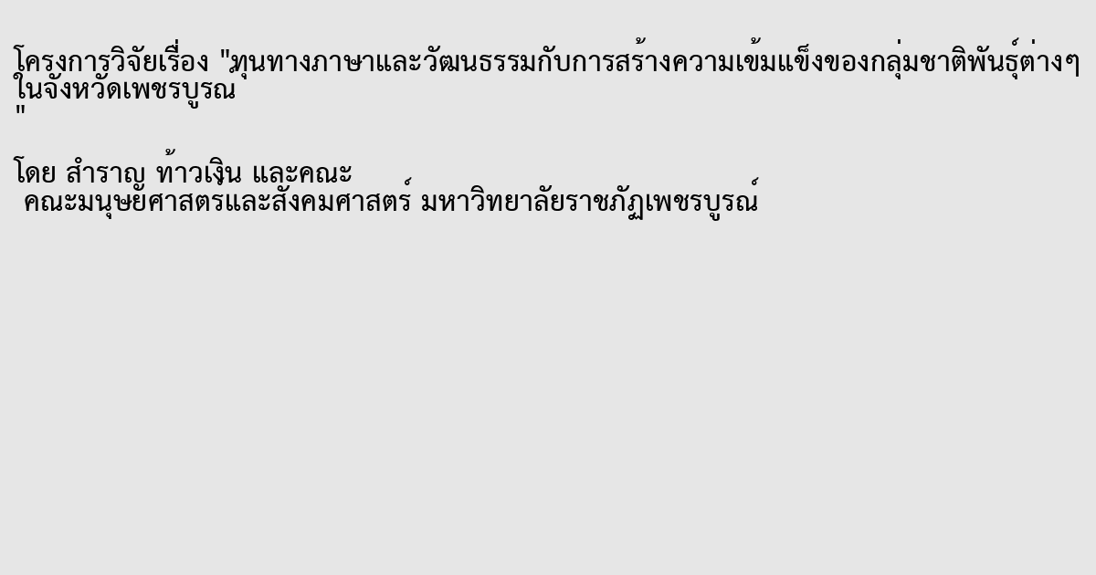 งานวิจัยนี้มีวัตถุประสงค์เพื่อศึกษาความสัมพันธ์ระหว่างทุนทางภาษาและวัฒนธรรมกับการสร้างความเข้มแข็งของกลุ่มชาติพันธุ์ต่างๆ ในจังหวัดเพชรบูรณ์ ประชากรที่ใช้ในการศึกษา ได้แก่ ชาวพื้นเมือง ชาวไทยหล่ม ชาวเขา (เผ่าม้ง เผ่าลีซอ เผ่าเย้า เผ่ามูเซอ) ชาวจีน ชาวบน ชาวลาว (ลาวพวน ลาวแง้ว ลาวครั่ง) ที่อาศัยอยู่ในจังหวัดเพชรบูรณ์ โดยใช้กระบวนการวิจัยเชิงปฏิบัติการแบบมีส่วนร่วม ซึ่งจากผลการวิจัยพบว่าภายหลังจากดำเนินการวิจัยการสร้างสังคมแห่งการเรียนรู้ความหลากหลายทางภาษาและวัฒนธรรมของกลุ่มชาติพันธุ์ต่างๆ ในจังหวัดเพชรบูรณ์ โดยให้ชุมชนเป็นผู้คิดและมีส่วนร่วมในการทำงานตั้งแต่เริ่มกำหนดโครงการ จนสิ้นสุดขั้นตอนสุดท้ายในการติดตามประเมินผล เน้นให้สมาชิกชุมชนรู้จักคิดวิเคราะห์ด้วยเหตุด้วยผล ส่งเสริมให้คนในชุมชนนำองค์ความรู้ไปสู่การปฎิบัติเพื่อการพัฒนาชุมชนต่อไป โดยผลการดำเนินงานดังกล่าวทำให้กลุ่มชาติพันธุ์ต่างๆ เห็นความสำคัญของการสร้างทุนทางสังคมและวัฒนธรรมของตนเอง ได้มีส่วนร่วมในการเรียนรู้ร่วมกันเพื่อที่จะนำไปสู่การนำทุนทางสังคมและวัฒนธรรมมาสร้างความเข้มแข็งของชุมชน และนำเอาอัตลักษณ์และเอกลักษณ์ของกลุ่มชาติพันธุ์ตนเองมาใช้ให้เป็นประโยชน์ พัฒนาเป็นสินค้าทางวัฒนธรรม ส่งเสริมความรู้ท้องถิ่นให้พัฒนาหรือต่อเติมจากในอดีต การบำรุงรักษา บันทึกวัฒนธรรมความรู้ที่กำลังจะสูญหาย การยอมรับและส่งเสริมความหลากหลายทางวัฒนธรรม การเชื่อมโยงทุนทางวัฒนธรรมเข้ากับระบบเศรษฐกิจและการจัดการในยุคใหม่
