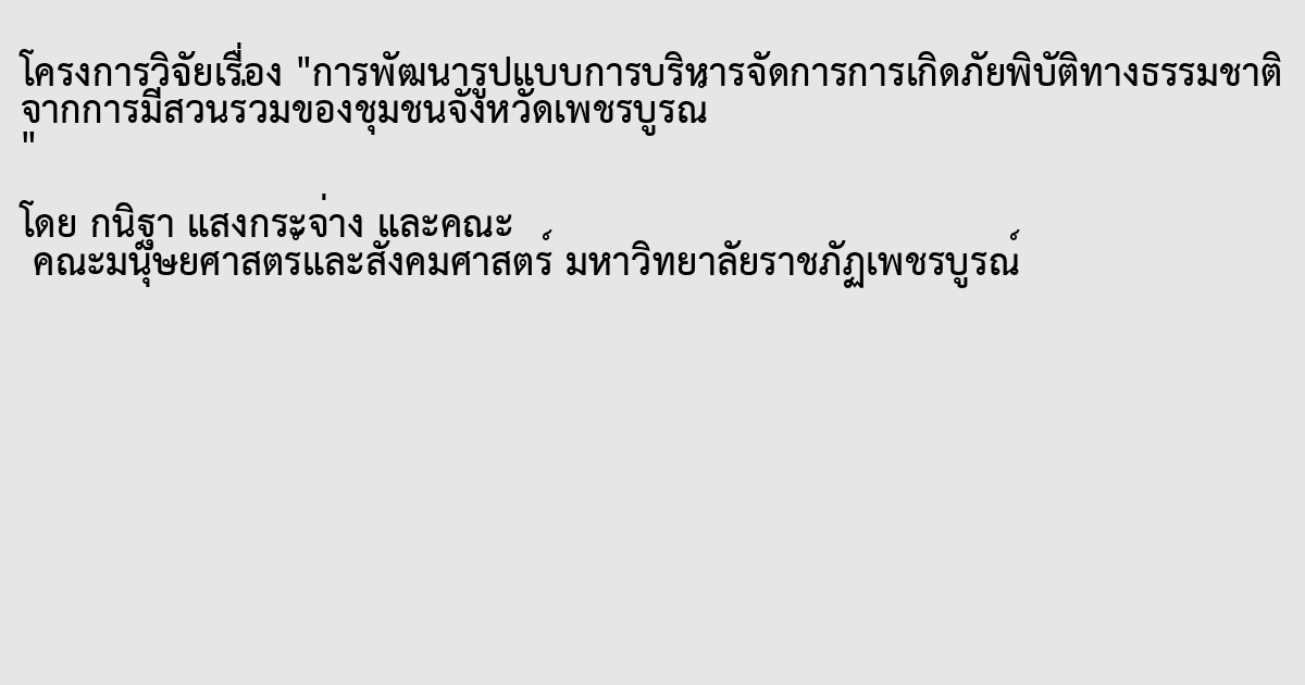 The objectives of this research was to study information that is fundamental in regards to natural disasters and how they affect the local people in Phetchabun province as well as to develop a model of natural disaster management for the community within Phetchanbun Province. Here are 7 samples of this research; 1) Index of item objectives in congruence to information sourced from 3 research specialists on the topic of natural disasters. 2) Samples of information from 2,000 people who have been effected by a natural disaster. 3) Insight from 40 people within the community. 4) 1,000 debating samples, On risky area management in relation to natural disasters within Phetchabun province , with opinions from citizen which are teachers, public health staff, sub-district developers, housewives, community leaders, public health volunteers, academicians. 5) Application of the information, to prepare for future natural disasters, based on 800 people within the community including teachers, students and general citizens of the community. 6) Courses of action constructed by 200 people within the community that are village leaders, village headmen, councilors and Phetchabun citizens, in order to prepare for the future disasters. 7) Network parties samples from 30 people which are professors, researchers and academicians. This study includes 8 districts and 26 sub-districts as target areas; Muang Phetchabun district (Tahbor sub-district, Baan tok sub-district, Pah Loa sub-district, Tah-pol sub-district, Sadieng sub-district and Wangchompoo sub-district) Chon Daen district (Chon Daen sub-district, Dong Kui sub-district, Tah Kham sub-district, Phuttabath sub-district, Tahkutrai sub-district and Salalai sub-district) Lom Sak district (Nam kor sub-district, Nam chun sub-district, Bung Nam Tao sub-district, Na Sum sub-district, Baan Nearn sub-district, Sira sub-district and Wang Ban sub-district ) Si Thep district (Si Thep sub-district and Bor Thai sub-district) Bueng Sam Phan (Nhong Jang sub-district and Sa-Kheaw sub-district) Nam Nao district (Lak Dan sub-district) Wang Pong district (Sub Pearb) and Khao Kho district (Khao Kho sub-district and Rim Sri Muang sub-district). The study utilizes research tools such as questionnaires and group interviews. Data analysis is done through descriptive analyze, average meaning and standard deviation. Research Results 1. Results from studying the fundamental information in regards to natural disasters and how they affect local people from Phetchabun province showed that Phetchabun is mountainous with a total area of 30% being forestation. This environment may cause small disasters and emergency situations. Phetchabun province has had extreme natural disasters such as floods, landslides, drought and winter hazards but, as of yet, relief roles, in regards to natural disaster management, have not been delegated to the people who live within the local community of Phetchabun. This is contrary to the fact that a plan has already been developed by the department of disaster prevention within the ministry of interior. 2. Developing a model of natural disaster management for the community in Phetchabun province has 3 steps; first is disaster prevention and relief, second is preparation and the last one is response and restoration. After the researchers synthesized the data with the network party related to natural disaster management which cause the research process to become action research that focus the participation of researchers, community and related organizations as 2.1 Disaster prevention and relief involves problems analysis, setting up goals and planning with the community and also preparing people within the community to cooperate with research team. 2.2 Preparation incorporates people in the community and related organizations. The research team had been studying the role people would play in the community of Phetchabun province in order to prevent a disaster. They also conducted rehearsals in a disaster situation. In order for effective preparation there needs to be cooperation from local people and people in the community. This cooperation divides into 3 levels as follow; Individual level- the changing of a person mind set to realize the need and be ready to take care of himself/herself when he/she faces a natural disaster. Area level – insuring the local people and people in the community of Phetchabun are being the main communicators and are involved in the relief plan developed for their area. This in turn makes the community stronger. If the community keeps waiting for the help from the government they would become weaker. Province level – obtaining prevention plans for natural disasters and also a long term management plan for natural disasters (flooding, land slides, drought and winter hazards) in Phetchabun and connecting provinces. 2.3 Response and restoration is the process that focuses on the knowledge that the community could build the last long project in the future and being a partner with everyone who was part of this study. The research team has studied with the specialists and evaluated the development of the model of natural disasters management for the community in Phetchabun province in 2 ways; the suitable of big picture idea and the suitable of process idea, which found that the average of both are high with 4.26 and 0.36 for standard deviation. As the specialists thought the development of the model of natural disasters management for the community in Phetchabun province is in high level so this research could use as a reference for the future study.