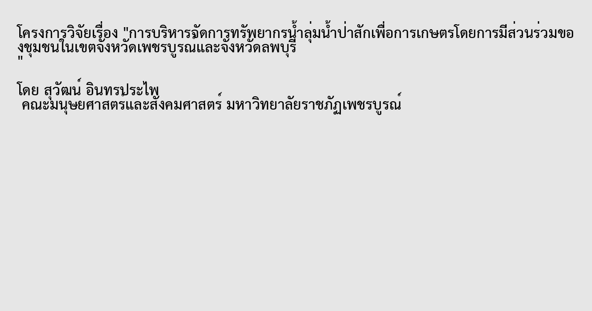 งานวิจัยนี้นำเสนอเรื่อง การบริหารจัดการทรัพยากรน้ำลุ่มน้ำป่าสักเพื่อการเกษตรโดยการมีส่วนร่วมของชุมชนในเขตจังหวัดเพชรบูรณ์และจังหวัดลพบุรี ซึ่งมีวัตถุประสงค์ 1) เพื่อศึกษาสภาพปัญหาในการบริหารจัดการทรัพยากรน้ำลุ่มน้ำป่าสักเพื่อการเกษตรในเขตจังหวัดเพชรบูรณ์และจังหวัดลพบุรี และ 2) เพื่อศึกษากระบวนการจัดการแหล่งน้ำเพื่อการเกษตรโดยการมีส่วนร่วมของชุมชนในเขตจังหวัดเพชรบูรณ์และจังหวัดลพบุรี ประชากรที่ศึกษา จำนวน 899 คน เครื่องมือที่ใช้ คือ แบบสอบถาม (Questionnaire) สัมภาษณ์เชิงลึก (In-deep Interview) และการสนทนากลุ่ม การวิจัยครั้งนี้เป็นการวิจัยเชิงปริมาณและเชิงคุณภาพ แล้วนำมาวิเคราะห์ให้เห็นกระบวนการบริหารจัดการทรัพยากรน้ำ การวิเคราะห์ทางสถิติโดยใช้สถิติเชิงพรรณนา (Descriptive Statistic) หาค่าร้อยละ ส่วนค่าเฉลี่ย ค่าเบี่ยงเบนมาตรฐาน ใช้สถิติวิเคราะห์ (Statistical Analysis)