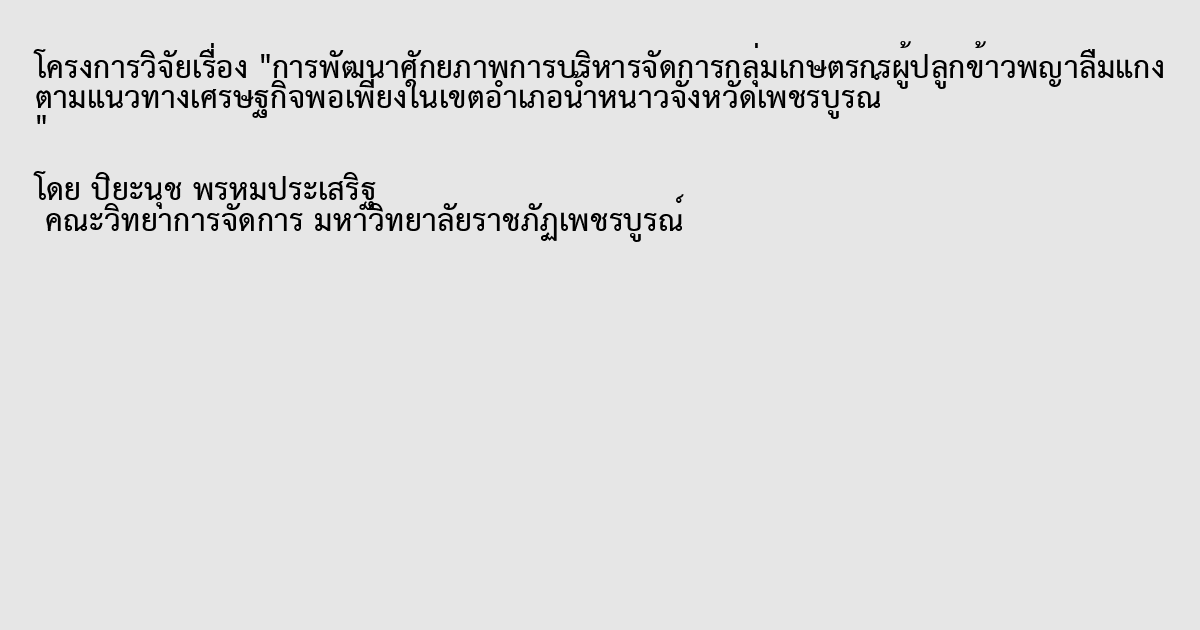 งานวิจัยนี้การพัฒนาศักยภาพการบริหารจัดการกลุ่มเกษตรกรผู้ปลูกข้าวพญาลืมแกงตามแนวทางเศรษฐกิจพอเพียง ในเขตอำเภอน้ำหนาว จังหวัดเพชรบูรณ์