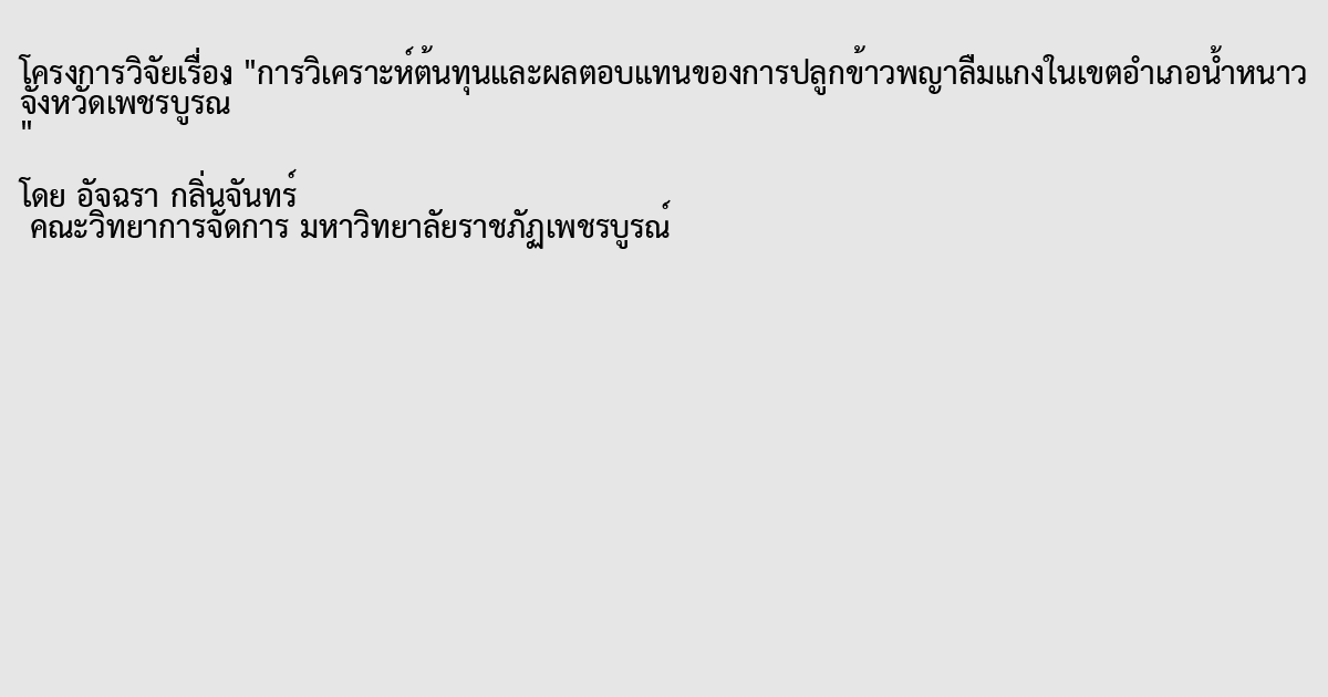 Analysis Cost and return on investment from Pa-yah Leum Gaeng Rice cultivation, Nam Nao District, Phetchabun Province. 1. To study the context Pa-yah Leum Gaeng rice production in the district, Nam Nao, Phetchabun 2. To study the cost and production yield Pa-yah Leum Gaeng rice 3. Pa-yah Leum Gaeng study ways to reduce costs and get higher returns. 4. To transfer the knowledge gained from research to farmers. Education of journals District Agriculture Office documents and interviews with officials involved Nam Nao. And questionnaires Pa-yah Leum Gaeng rice farmers in the district, Nam Nao total of 47 cases were analyzed by using percentage.