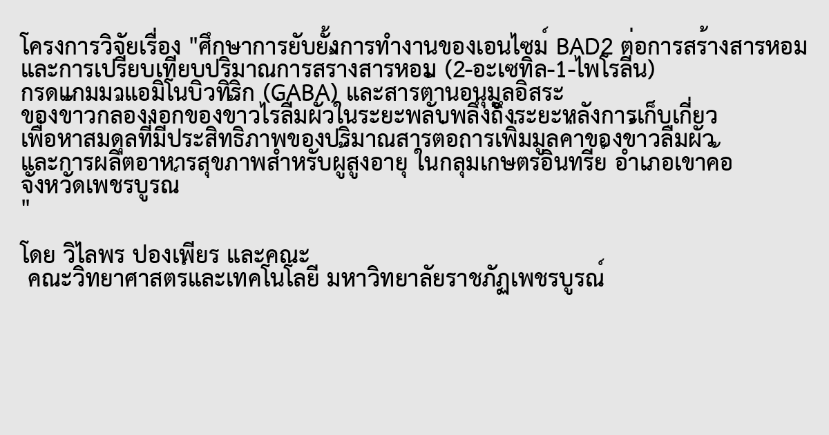 The Study of The Inhibition of Enzyme (BAD2) to The Synthesis of Fragrance (2-Acetyl-1-Pyrroline) and Quantitatively Comparison of The Rice Substances for Its Fragrance (2-Acetyl- 1-Pyrroline), γ-Aminobutyric Acid (GABA), and Antioxidants Activity in Germinated Luempua Rice from The Maturation Stages to Post-Harvest Stages to Find The Effective Balance of Substance for Value Added of The Luempua Rice Production and Healthy Diet Productions for The Elderly, at Organic Agriculture Group, Khao Kho District, Phetchabun ProvinceThe Effective Balance of Substance for Value Added of The Luempua Rice Production and Healthy Diet Productions for The Elderly, at Organic Agriculture Group, Khao Kho District, Phetchabun Province