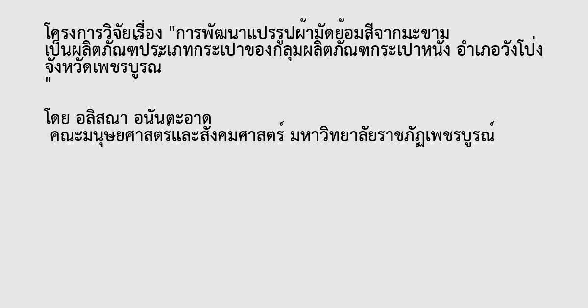 การพัฒนาแปรรูปผ้ามัดย้อมสีจากมะขาม เป็นผลิตภัณฑ์ประเภทกระเป๋าของกลุ่มผลิตภัณฑ์กระเป๋าหนัง อำเภอวังโป่ง จังหวัดเพชรบูรณ์