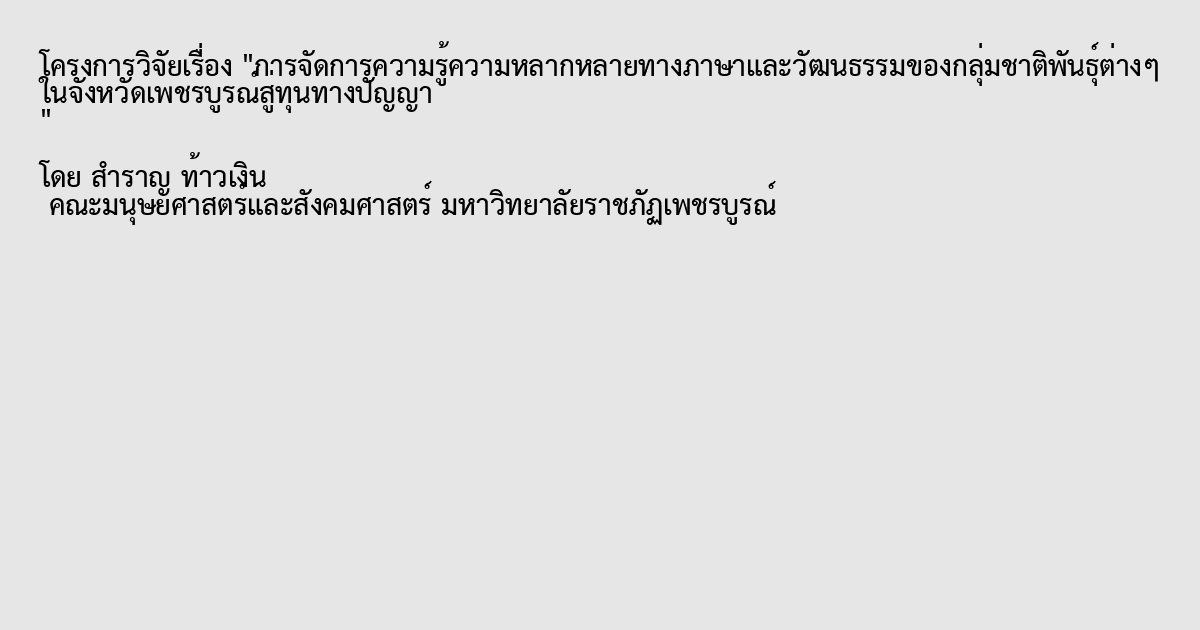 งานวิจัยนี้มีวัตถุประสงค์เพื่อศึกษาความหลากหลายทางภาษาและวัฒนธรรมของกลุ่มชาติพันธุ์ต่างๆ ที่มาตั้งถิ่นฐานอยู่ในจังหวัดเพชรบูรณ์ และดำเนินการจัดการความรู้ความหลากหลายทางภาษาและวัฒนธรรมกลุ่มชาติพันธุ์ดังกล่าว เพื่อการอนุรักษ์และสืบสานความหลากหลายทางภาษาและวัฒนธรรมตลอดจนอัตลักษณ์ของกลุ่มชาติพันธุ์ต่างๆ ในจังหวัดเพชรบูรณ์ การวิจัยนี้เป็นการวิจัยเชิงคุณภาพ โดยใช้ระเบียบวิธีวิจัยเชิงปฏิบัติการแบบมีส่วนร่วม ประชากรที่ใช้ในการศึกษา ได้แก่ ชาวพื้นเมือง ชาวไทยหล่ม ชาวเขาเผ่าม้ง เผ่าลีซอ เผ่าเย้า เผ่ามูเซอ ชาวจีน ชาวบน ชาวลาวพวน ลาวแง้ว ลาวครั่ง ตามกรอบแนวคิดการวิจัยว่าด้วยกระบวนการจัดการความรู้ทั้ง 7 ขั้นตอน ได้แก่ การค้นหาความรู้ การสร้างและแสวงหาความรู้ การจัดความรู้ให้เป็นระบบ การประมวลและกลั่นกรองความรู้ การเข้าถึงความรู้ การแบ่งปันและแลกเปลี่ยนความรู้ และการเรียนรู้ ผลการวิจัยพบว่า หลังจากการจัดการความรู้ความหลากหลายทางภาษาและวัฒนธรรมของกลุ่มชาติพันธุ์ต่างๆ ในจังหวัดเพชรบูรณ์ โดยการแบ่งปันและแลกเปลี่ยนเรียนรู้ การรวบรวมข้อมูลองค์ความรู้จัดทำชุดความรู้ความหลากหลายทางภาษาและวัฒนธรรมของกลุ่มชาติพันธุ์ต่างๆ ก่อให้เกิดเครือข่ายความร่วมมือของกลุ่มชาติพันธุ์ต่างๆ เพื่อแลกเปลี่ยนเรียนรู้ซึ่งกันและกัน มีกิจกรรมแลกเปลี่ยนเรียนรู้ภายในกลุ่มชาติพันธุ์ต่างๆ ทำให้กลุ่มชาติพันธุ์ต่างๆ มีการจัดการความรู้อย่างเป็นระบบ โดยการจัดทำฐานข้อมูลภาษาและวัฒนธรรมของกลุ่มชาติพันธุ์ต่างๆ ในจังหวัดเพชรบูรณ์ เพื่อเป็นแหล่งเรียนรู้ของกลุ่มชาติพันธุ์ต่างๆ ส่งผลให้เกิดการอนุรักษ์และฟื้นฟูภาษาและวัฒนธรรมของกลุ่มชาติพันธุ์ตนเองอย่างมีประสิทธิผล
