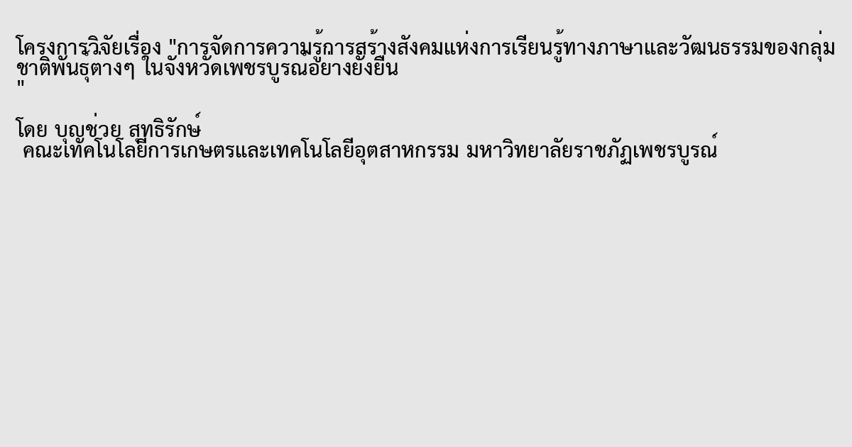 งานวิจัยนี้มีวัตถุประสงค์เพื่อศึกษาบริบทชุมชน ประวัติศาสตร์ความเป็นมา ลักษณะทางกายภาพ/ชีวภาพของชุมชน ลักษณะประชากร ลักษณะทางเศรษฐกิจ ลักษณะทางสังคม ภาษา ระบบความเชื่อ ประเพณีและวัฒนธรรม เพื่อพัฒนาการจัดการความรู้การสร้างสังคมแห่งการเรียนรู้ทางภาษาและวัฒนธรรมของจังหวัดเพชรบูรณ์อย่างยั่งยืน และเพื่อศึกษาผลของการจัดการความรู้การสร้างสังคมแห่งการเรียนรู้ทางภาษาและวัฒนธรรมของจังหวัดเพชรบูรณ์อย่างยั่งยืน ประชากรที่ใช้ในการศึกษาการจัดการความรู้การสร้างสังคมแห่งการเรียนรู้ทางภาษาและวัฒนธรรมของจังหวัดเพชรบูรณ์อย่างยั่งยืน ได้แก่ ชาวพื้นเมือง ชาวไทยหล่ม ชาวเขา (เผ่าม้ง เผ่าลีซอ เผ่าเย้า เผ่ามูเซอ) ชาวจีน ชาวบน ชาวลาว (ลาวพวน ลาวแง้ว ลาวครั่ง) ที่อาศัยอยู่ในจังหวัดเพชรบูรณ์ เครื่องมือที่ใช้ในการวิจัยได้แก่ แบบสัมภาษณ์ และแบบสังเกต ผลการวิจัยพบว่า การพัฒนาการจัดการความรู้การสร้างสังคมแห่งการเรียนรู้ความหลากหลายทางภาษาและวัฒนธรรม ไม่สามารถทำได้ตามวัตถุประสงค์ และผลการจัดการความรู้การสร้างสังคมแห่งการเรียนรู้ความหลากหลายทางภาษาและวัฒนธรรม พบว่าในแต่ละกลุ่มชาติพันธุ์มีการจัดการความรู้ในช่วงระยะเวลาสั้นๆ เท่านั้น และกลุ่มชาติพันธุ์ต่างๆ มาร่วมกันไม่ได้ เนื่องจากมีปัญหาในทุกด้านของบริบทชุมชน