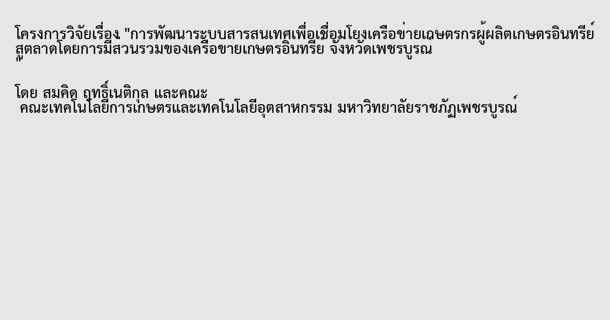 การจัดทำและพัฒนาระบบสารสนเทศเชื่อมโยงข้อมูลของเครือข่ายเกษตรกรผู้ผลิตเกษตรอินทรีย์ ระดับชุมชนในจังหวัดเพชรบูรณ์ และผู้จัดจำหน่าย ให้เป็นปัจจุบัน พบว่า จากการจัดตั้งศูนย์ระดับจังหวัดดำเนินการอบรมให้กับเจ้าหน้าที่ถึงการใช้งานระบบ มีเจ้าหน้าที่ศูนย์ระดับจังหวัดถ่ายทอดวิธีการบันทึกข้อมูลผลผลิตในระบบเว็บฐานข้อมูลเครือข่ายผู้ผลิตเกษตรอินทรีย์แก่สมาชิกในเครือข่าย และวิธีการใช้งานส่วนรายงานผลข้อมูล สามารถใช้งานง่ายได้สะดวก รวดเร็ว ถูกต้องครบถ้วน การสร้างเว็บไซด์แสดงผลผลิตของสมาชิกเครือข่ายเกษตรอินทรีย์เพชรบูรณ์ ผ่านโปรแกรมสำเร็จรูปในการพัฒนาเว็บไซต์ได้แก่ โปรแกรมแมโครมีเดียดรีมวีพเวอร์ โดยมีขั้นตอนการพัฒนาเว็บไซต์ 4 ขั้นตอน ดังนี้ 1) ขั้นก่อนการผลิต เป็นการศึกษา เนื้อหาเบื้องต้น การออกแบบโครงสร้างเว็บไซต์ 2) ขั้นการผลิตเป็นการสร้างโฮมเพจเว็บเพจหน้าต่างๆ และการเชื่อมโยง 3) ขั้นหลังการผลิตเป็นการนำเว็บไซต์ที่พัฒนาเสร็จแล้วขึ้นเผยแพร่บนอินเทอร์เน็ต และ 4) การประเมินผล เป็นการตรวจสอบและทดสอบระบบ http://www.pbnorganic.com และความพึงพอใจของกลุ่มตัวอย่างที่มีต่อเว็บไซต์โดยรวมทุกด้านอยู่ในระดับมาก และเมื่อพิจารณารายด้าน พบว่า กลุ่มตัวอย่างมีความพึงพอใจต่อเว็บไซต์อยู่ในระดับมากทุกด้านเช่นเดียวกัน โดยกลุ่มตัวอย่าง มีความพึงพอใจ ด้านตัวอักษรและการจัดรูปแบบข้อความมีค่าเฉลี่ยสูงสุด รองลงมาคือ ด้านข้อมูลที่นำเสนอบนเว็บไซต์ ด้านการใช้สีในเว็บเพจด้านกราฟิก และด้านการเข้าถึงข้อมูลในเว็บเพจ ตามลำดับความคิดเห็นและข้อเสนอแนะอื่นๆควรประชาสัมพันธ์ให้ประชาชนได้เข้าเยี่ยมชมเว็บไซต์เพื่อเป็นส่วนหนึ่งในการประชาสัมพันธ์