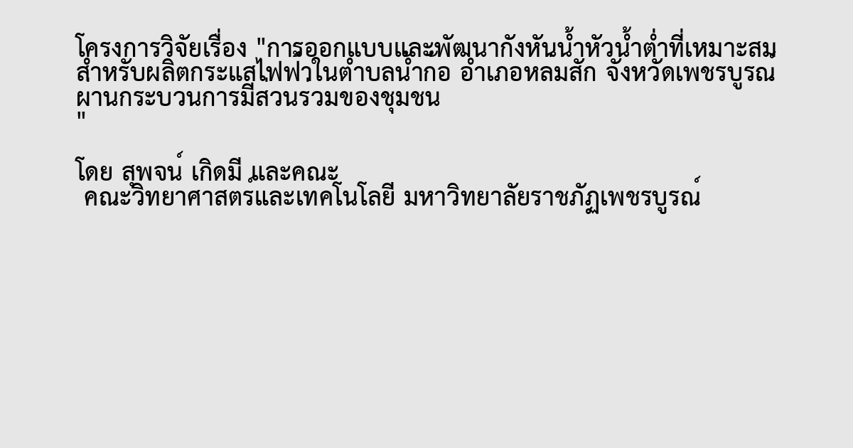การออกแบบและพัฒนากังหันน้ำหัวน้ำต่ำที่เหมาะสม สำหรับผลิตกระแสไฟฟ้าในตำบลน้ำก้อ อำเภอหล่มสัก จังหวัดเพชรบูรณ์ ผ่านกระบวนการมีส่วนร่วมของชุมชน