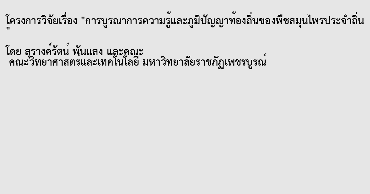 This cross-section study was focused to the useful of the herbal plants by the people in Lomsak District, Phetchabun Province. This study explored on the knowledge of popular herbal usefulness. Questionnaire and interview was used to collect the data among population and rural herbalist. In addition the characteristic of radical scavenging activity in local herbs were investigated. This study divided into four parts.