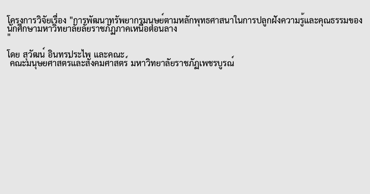 งานวิจัยนี้นำเสนอเรื่อง การพัฒนาทรัพยากรมนุษย์ตามหลักพุทธศาสนาในการปลูกฝังความรู้และคุณธรรมของนักศึกษามหาวิทยาลัยราชภัฏภาคเหนือตอนล่างวัตถุประสงค์สรุป อภิปรายผล และข้อเสนอแนะเพื่อ 1. หลักธรรมสำหรับการพัฒนาทรัพยากรมนุษย์ตามหลักพระพุทธศาสนา 2.หลักธรรมที่สอดคล้องกับการพัฒนาทรัพยากรมนุษย์ตามหลักพุทธศาสนาและ 3. แนวทางการพัฒนาทรัพยากรมนุษย์ตามหลักพุทธศาสนาในการปลูกฝังความรู้และคุณธรรมของนักศึกษามหาวิทยาลัยราชภัฏภาคเหนือตอนล่าง ได้แบ่งออกเป็นการวิจัยเชิงปริมาณและการวิจัยเชิงคุณภาพ การวิจัยเชิงปริมาณกลุ่มตัวอย่างทั้งหมด จำนวน 396 คนมาวิเคราะห์อธิบายเชิงสถิติพรรณนา โดยใช้โปรแกรมสำเร็จรูปการวิเคราะห์ข้อมูลทางสังคมศาสตร์ การวิจัยเชิงคุณภาพจากการสัมภาษณ์เชิงลึก (In-depth interview research) อาจารย์ผู้สอนเกี่ยวกับวิชาเกี่ยวกับคุณธรรมและจริยธรรมหรือวิชาทางด้านการพัฒนาทรัพยากรมนุษย์ จำนวน 24 คน การสนทนากลุ่ม (Focus Group Discussion) จำนวน 10 คน เครื่องมือที่ใช้ คือ แบบสอบถาม (Questionnaire) สัมภาษณ์เชิงลึก (In-deep Interview) และการสนทนากลุ่ม การวิเคราะห์ทางสถิติโดยใช้สถิติเชิงพรรณนา (Descriptive Statistic) หาค่าร้อยละ ส่วนค่าเฉลี่ย ค่าเบี่ยงเบนมาตรฐาน ใช้สถิติวิเคราะห์ (Statistical Analysis)