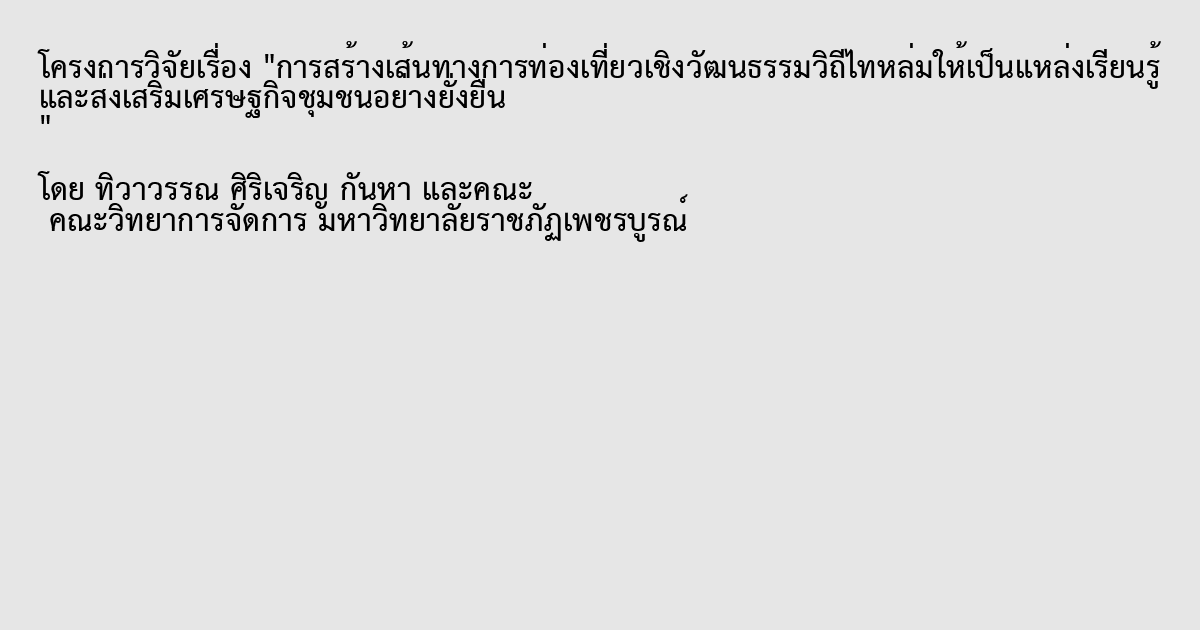 The researcher classified the group and the importance of designing the cultural tourism element route of Thai-Lom Lifestyles into 6 key characteristics, which were ethnic, historical and ancient monument, architecture, cultures and folk cultures , Lifestyle and wisdom folkway for participatory action. Research has found that the representatives agree on the development of Cultural-based Tourism Route of Thai-Lom Lifestyles because they can gain benefits from Cultural-based Tourism Route including the possibilities that they can take part in supporting the culture heritage conservation and appreciation. The researcher applied the data to designed - tourism route, the experiment result, route testing, and real-location route to establish a tourism route which an establishment of travelogue named “Thai Lom - a quiet and Charming town” It’s a one-day trip which easy to travel and get information, destination and to do the activities according to tourist’s interests.