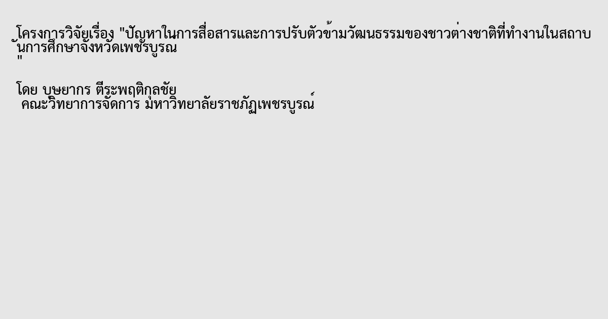 งานวิจัยเรื่อง “ปัญหาในการสื่อสารและการปรับตัวข้ามวัฒนธรรมของชาวต่างชาติที่ทำงานในสถาบันการศึกษาจังหวัดเพชรบูรณ์” เป็นงานวิจัยเชิงคุณภาพ มีวัตถุประสงค์ในการศึกษา 4 ข้อ คือ 1) เพื่อศึกษาปัญหาของชาวต่างชาติในการทำงานในสถาบันการศึกษา 2)เพื่อศึกษาเครือข่ายการสื่อสารของชาวต่างชาติ 3)เพื่อศึกษาทัศนคติของชาวต่างชาติต่อการทำงานร่วมกับชาวไทย 4)เพื่อศึกษาการรับตัวข้าววัฒนธรรมของชาวต่างชาติในการทำงานในสถาบันการศึกษา โดยทำการศึกษากลุ่มผู้ให้ข้อมูลหลัก 2 กลุ่ม รวม 20 คน กลุ่มแรกเป็นชาวต่างชาติซึ่งทำงานในสถาบันการศึกษาจังหวัดเพชรบูรณ์จำนวน 16 คน กลุ่มที่สองเป็นเพื่อนร่วมงานชาวไทยจำนวน 4 คน เก็บรวบรวมข้อมูลจากการสัมภาษณ์เชิงลึกและการสนทนากลุ่ม
