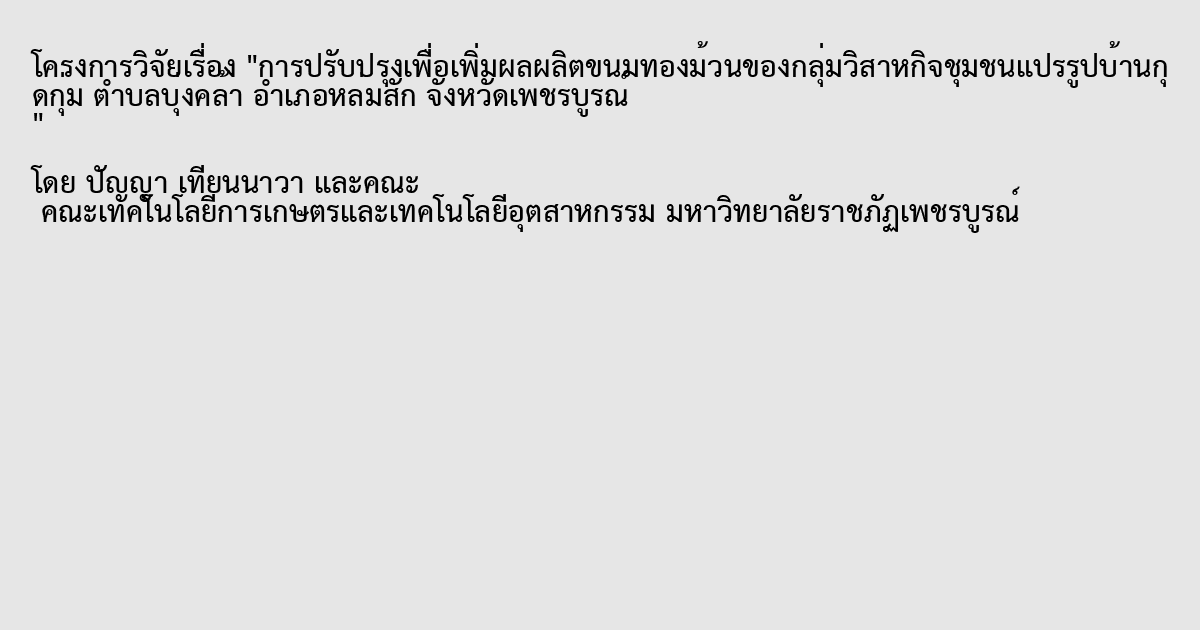 ชุดโครงการวิจัยการปรับปรุงเพื่อเพิ่มผลผลิตขนมทองม้วนของ กลุ่มวิสาหกิจชุมชนแปรรูปบ้านกุดกุ่ม ตำบลบุ่งคล้า อำเภอหล่มสัก จังหวัดเพชรบูรณ์ มี 3 โครงการวิจัยดังนี้ 1.การเพิ่มผลผลิตผลิตภัณฑ์ขนมทองม้วนโดยวิธีการการศึกษาการทำงานของกลุ่ม วิสาหกิจ ชุมชนแปรรูปบ้านกุดกุ่ม ตำบลบุ่งคล้า อำเภอหล่มสัก จังหวัดเพชรบูรณ์ งานวิจัยชิ้นนี้มีวัตถุประสงค์เพื่อพัฒนาวิธีการทำขนมทองม้วนของวิสาหกิจชุมชนแปรรูปบ้านกุดกุ่ม จังหวัดเพชรบูรณ์ เนื่องจากวิธีการทำงานแบบเดิมล่าช้า ส่งผลให้ผู้ประกอบการไม่สามารถส่งสินค้าให้แก่ลูกค้าได้ทันตามกำหนดเวลา ดังนั้นคณะผู้วิจัยจึงประยุกต์ใช้ระบบวิธีการวัดเวลาแบบ MTM 1 ซึ่งเป็นเทคนิคในการหาเวลามาตรฐานการทำงานจากการเคลื่อนไหวร่างกาย เพื่อให้ทราบถึงเวลามาตรฐานการทำงานแบบเดิมและการเคลื่อนไหวสูญเปล่าที่ทำให้เกิดความล่าช้า จากปัญหาดังกล่าวผู้วิจัยจึงได้ออกแบบและสร้างอุปกรณ์ขึ้นมา 2 ชิ้น ประกอบด้วย ชุดกลไกสำหรับใช้เหยียบเพื่อเปิดฝาชุดทำขนมทองม้วน และเก้าอี้ปฏิบัติงาน ผลที่ได้จากการนำอุปกรณ์มาใช้พบว่า สามารถลดเวลาการทำงานลงได้ร้อยละ 15.61 ซึ่งถ้าหาก 1 วันพนักงานผลิตได้ 1,500 ชิ้น จากเดิมใช้เวลา 5 ชั่วโมง 41 นาที เมื่อปรับปรุงกระบวนการแล้ว จะใช้เวลาเพียง 4 ชั่วโมง 58 นาที อย่างไรก็ตามถึงจะลดเวลาการทำงานได้เพียงเล็กน้อย แต่จากการสอบถามผู้ปฏิบัติงานพบว่าอุปกรณ์ที่ออกแบบมาสามารถช่วยให้ความเมื่อยล้าในการทำงานลดลงกว่าวิธีการเดิม และเมื่อตรวจสอบพบว่าจำนวนครั้งในการเคลื่อนไหวของร่ายกายลดลงถึงร้อยละ 17.74 2.การประยุกต์ใช้วิศวกรรมคันไซในการพัฒนาเพื่อเพิ่มมูลค่าผลิตภัณฑ์ขนมทองม้วนของกลุ่มวิสาหกิจชุมชนแปรรูปบ้านกุดกุ่ม ตำบลบุ่งคล้า อำเภอหล่มสัก จังหวัดเพชรบูรณ์ งานวิจัยชิ้นนี้มีวัตถุประสงค์เพื่อประยุกต์ใช้วิศวกรรมคันไซในการพัฒนาผลิตภัณฑ์ขนมทองม้วนให้มีมูลค่าเพิ่มขึ้นในอนาคต เพื่อต่อยอดธุรกิจเดิมให้เกิดแนวความคิดในการพัฒนาผลิตภัณฑ์ขนมทองม้วนที่สามารถตอบสนองต่อพฤติกรรมและความต้องการของผู้บริโภคที่เป็นวัยรุ่นอายุ 12 – 21 ปีได้ โดยผู้วิจัยได้ดำเนินการเลือกขอบเขตของกลุ่มผลิตภัณฑ์ที่นำมาศึกษา กำหนดขอบเขตคำคันไซและคัดเลือกคำคันไซ รวบรวมและคัดเลือกคุณลักษณะของผลิตภัณฑ์ ทำการวิเคราะห์ผลความสัมพันธ์ระหว่างคำคันไซและคุณลักษณะของขนมทองม้วนโดยใช้แบบสอบถามเป็นเครื่องมือ แล้วนำผลแนวคิดที่ได้ไปให้ผู้เชี่ยวชาญทำการวิเคราะห์ด้วยมือ จากนั้นตรวจสอบความถูกต้องของแนวคิดนั
