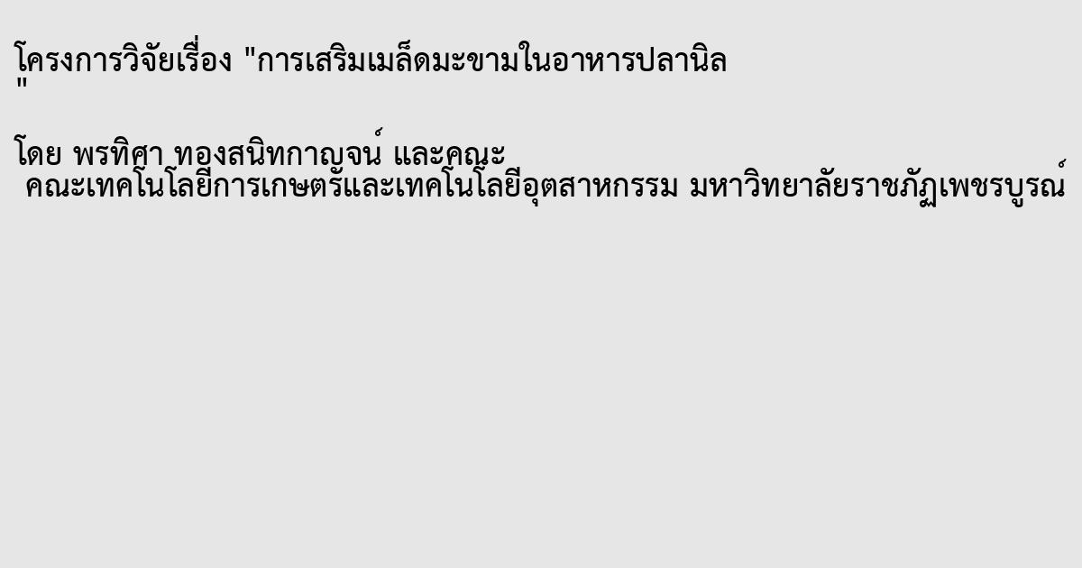 งานวิจยัน้ีมีแผนการทดลองแบบสุ่มสมบูรณ์ ที่ประกอบด้วย 4 ชุดการทดลอง ชุดการทดลอง ละ 3 ซ้ าไดแ้ก่อาหารที่ไม่มีการเสริมเมล็ดมะขาม (ชุดควบคุม), อาหารเสริมเมล็ดมะขามที่ระดับ 5 เปอร์เซ็นต์(T2), อาหารเสริมเมล็ดมะขามที่ระดับ 10 เปอร์เซ็นต์(T3) และอาหารเสริมเมล็ดมะขาม ที่ระดับ 15 เปอร์เซ็นต์(T4) โดยมีวัตถุประสงค์เพื่อศึกษาคุณภาพเม็ดอาหาร ผลของการเสริมเมล็ด มะขามในอาหารปลานิล และต้นทุนการผลิตอาหาร การศึกษาคุณภาพเม็ดอาหาร ท าได้โดยการ วิเคราะห์ความคงทนของอาหารในน้า และวิเคราะห์ค่าเปอร์เซ็นต์ฝุ่น ศึกษาผลของการเสริมเมล็ด มะขาม โดยใช้ปลานิลขนาด 0.6 ? 1 กรัม ให้อาหารปลานิลที่อัตรา 5 เปอร์เซ็นต์ของน้ าหนกั ตัว จำนวน 3 ม้ือต่อวนั เป็นระยะเวลา 8 สัปดาห์ เพื่อศึกษาผลการเจริญเติบโต ปริมาณอาหารที่กิน อตัราแลกเน้ืออัตราการรอดตาย เมื่อสิ้นสุดการทดลอง บันทึกข้อมูลและวิเคราะห์ผลทางสถิติด้วย โปรแกรมวิเคราะห์สถิติส าเร็จรูปผลลพัธข์องงานวิจยัน้ีพบว่าอาหารเสริมเมล็ดมะขามที่ระดับ 5 เปอร์เซ็นต์(T2) มีค่าคุณภาพเม็ดอาหาร และมีผลต่อการเจริญเติบโตของปลานิลดีกว่าทุกชุดการทดลอง การเสริมเมล็ดมะขาม ช่วยลดตน้ ทุนค่าอาหารของการเพาะเลี้ยงสัตว์น้ำได้