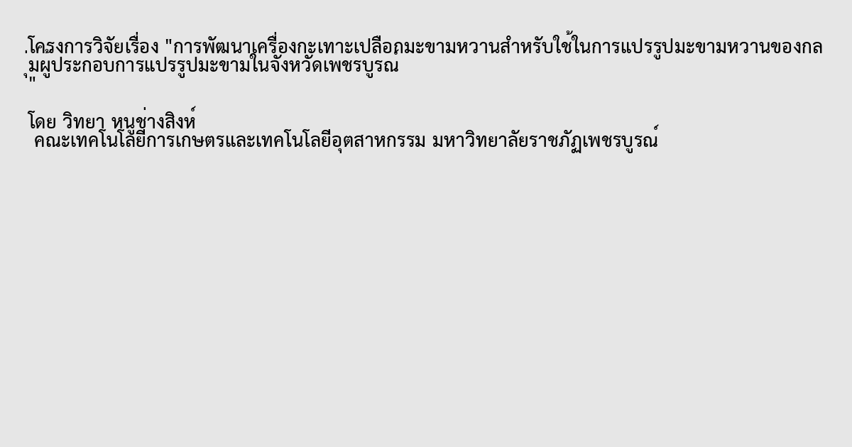 งานวิจัยชิ้นนี้เป็นการออกแบบและสร้างเครื่องกะเทาะเปลือกมะขาม วัตถุประสงค์เพื่อทดสอบประสิทธิภาพในการกะเทาะเปลือก ในการทดสอบแบ่งออกเป็น 2 ระยะ โดยระยะที่ 1 เป็นการทดลองเบื้องต้น และการทดลองเพื่อหาความเร็วรอบที่เหมาะสม การทดลองเบื้องต้นได้ทดลองกับมะขามจานวน 100 ฝัก โดยแบ่งออกเป็น 10 กลุ่ม กลุ่มละ 10 ฝัก จากการทดลองพบว่า ใช้เวลาเฉลี่ยในการกะเทาะเพียง 7 วินาทีต่อการกะเทาะ 10 ฝัก ซึ่งรวดเร็วกว่าเมื่อเทียบกับการใช้แรงงานคนแกะ และเมื่อตรวจสอบร้อยละพื้นที่ที่เครื่องจักรสามารถกะเทาะเปลือกได้ พบว่าเครื่องจักรมีประสิทธิภาพในการกะเทาะเฉลี่ยร้อยละ 89 ของพื้นที่การกะเทาะทั้งหมด แต่ถึงความสามารถในการกะเทาะมีสูง แต่ก็ยังมีฝุ่นที่ติดมากับเนื้อมะขาม และมีมะขามที่ฉีกขาดจานวน 3 ฝักจากจานวนมะขามทั้งหมด ส่วนในการทดลองเพื่อหาความเร็วรอบที่เหมาะสม คณะผู้วิจัยได้ทดสอบโดยการเปรียบเทียบการทางานจากการปรับเปลี่ยนความเร็วรอบทั้ง 3 ระดับ โดยการทาซ้าจานวน 30 ฝัก ผลที่ได้คือร้อยละพื้นที่ที่ถูกกะเทาะเฉลี่ยของความเร็วรอบที่ 800 และ 900 ร้อยละพื้นที่ที่ถูกกะเทาะมีความใกล้เคียงกันมาก ส่วนระดับที่ผลออกมาแย่ที่สุดในความเร็วรอบ 3 ระดับคือที่ความเร็วรอบ 1,200 รอบต่อนาที ซึ่งมีจานวนฝักในการฉีกขาดมากที่สุดส่งผลให้มีร้อยละของพื้นที่ที่ถูกกะเทาะเฉลี่ยน้อยที่สุด จากนั้นได้การวิเคราะห์ความแปรปรวน แบบจาแนกทางเดียว เพื่อหาผลกระทบจากการเปลี่ยนแปลงความเร็วรอบ ซึ่งได้พบว่า ค่า P value มีค่าเท่ากับมีค่ามากกว่า 0.05 ดังนั้นจึงสรุปได้ว่าการเปลี่ยนแปลงความเร็วรอบไม่มีส่งผลต่อประสิทธิภาพการกะเทาะเปลือกมะขามอย่างมีนัยสาคัญ แต่ถึงอย่างไรก็ตามได้แนะนาให้มีการตั้งค่าความเร็วรอบการกะเทาะเปลือกมะขามไว้ที่ 800 รอบต่อนาที ซึ่งเป็นการกะเทาะเปลือกที่ดีที่สุดในความเร็วทั้ง 3 ระดับ