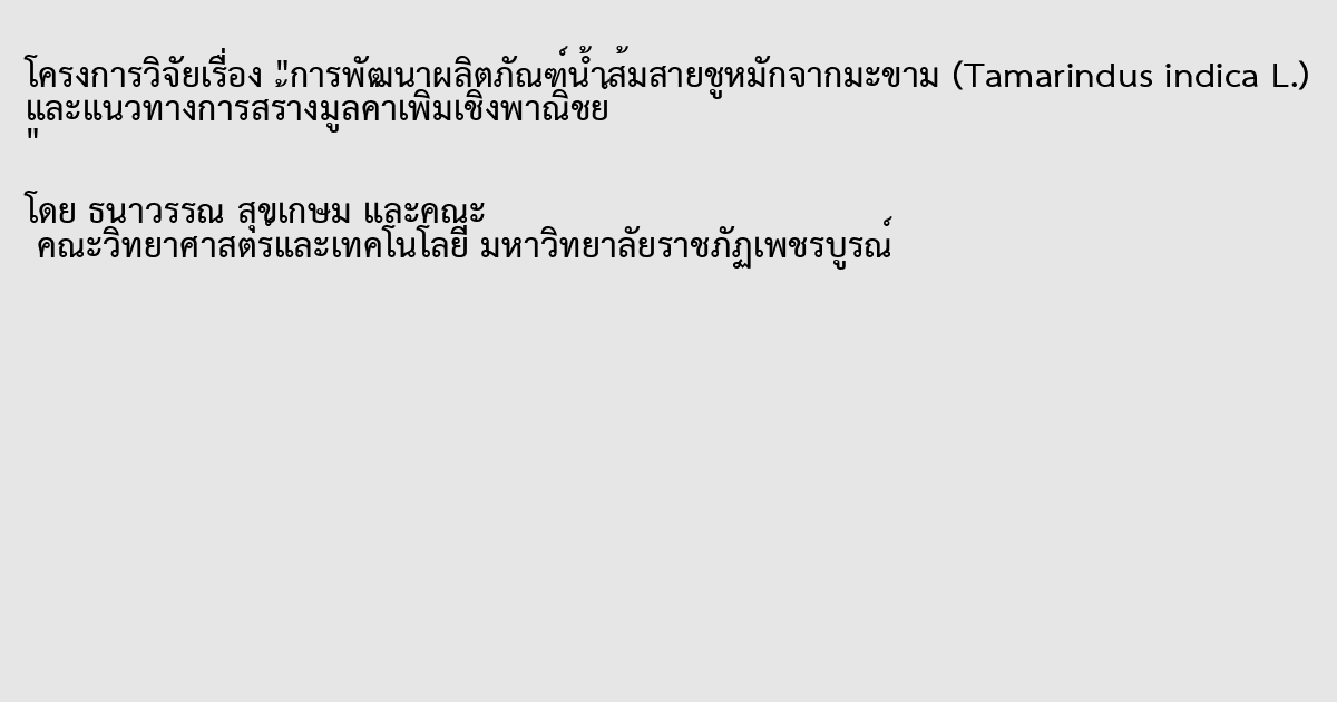 ชื่อเรื่อง การพัฒนาผลิตภัณฑ์น้ำส้มสายชูหมักจากมะขาม (Tamarindus indica L.) และแนวทางการสร้างมูลค่าเพิ่มเชิงพาณิชย์ ผู้วิจัย ธนาวรรณ สุขเกษม บทคัดย่อ การวิจัยครั้งนี้มีจุดมุ่งหมายเพื่อทำการศึกษากระบวนการผลิตน้ำส้มสายชูหมักจากมะขาม (Tamarindus indica L.) และแนวทางการสร้างมูลค่าเพิ่มเชิงพาณิชย์ โดยทำการหมักน้ำส้มสายชูจากมะขามทั้งหมด 4 สายพันธุ์ ได้แก่ พันธุ์ประกายทอง พันธุ์สีทอง พันธุ์ศรีชมพู และมะขามเปรี้ยวพันธุ์ยักษ์ โดยทำการศึกษาลักษณะกระบวนการผลิตในอัตราส่วนเนื้อมะขามต่อน้ำ ในอัตราส่วน 1 : 2 แล้วนำมาวิเคราะห์คุณภาพทางกายภาพ เคมี จุลชีววิทยา สารประกอบฟีนอลิก ฤทธิ์ต้านอนุมูลอิสระ สารปนเปื้อน และนำมาเพิ่มมูลค่าทางพาณิชย์โดยนำมาผลิตเป็นเครื่องดื่มน้ำส้มสายชูพร้อมดื่มโดยใช้สารให้ความหวาน 3 ชนิด ได้แก่ ซูโครส ฟรุกโตสไซรัป และกลูโคสไซรัป พบว่าน้ำส้มสายชูจากมะขามพันธุ์ประกายทองให้คุณภาพทางกายภาพ ทางเคมี และทางจุลชีววิทยาดีกว่ามะขามสายพันธุ์อื่น ๆ โดยจะมีค่า L* สูง และค่า a* และ b* มีค่าเป็นบวกบ่งบอกถึงน้ำส้มสายชูที่ผลิตได้มีสีน้ำตาลแดงเข้ม มีความใส ปริมาณกรดอะซิตริก 1.54 – 2.87 % ปริมาณของแข็งที่ละลายได้ 6.37 – 8.23 OBrix ปริมาณแอลกอฮอล์ 10.47 – 3.43 % จากนั้นนำมาผลิตเป็นน้ำส้มสายชูหมักพร้อมดื่มจากมะขามที่หมักด้วยเชื้อแบคทีเรีย Acetobacter aceti TISTR 102 โดยใช้เวลาในการหมัก 30 วัน จากนั้นนำมาทดสอบลักษณะทางประสาทสัมผัสของผู้บริโภคทางด้านสี กลิ่น รส ลักษณะเนื้อสัมผัส และความชอบโดยรวม ด้วยวิธี 9 point hedonic scale พบว่าน้ำส้มสายชูหมักพร้อมดื่มจากมะขามพันธุ์ประกายทองผสมฟรุกโทสเข้มข้น 3 ได้รับความพึงพอใจจากผู้บริโภคมากที่สุดมีคะแนนความชอบโดยรวม 7.00 เนื่องจากน้ำส้มสายชูหมักพร้อมดื่มมีลักษณะเปรี้ยว และมีกลิ่นหมักอ่อน ๆ มีปริมาณวิตามินซี 6.93มิลลิกรัมต่อ 100 มิลลิลิตร ปริมาณสารประกอบฟีนอลิก 0.62 มิลลิกรัมแกลลิคต่อมิลลิลิตร ฤทธิ์ต้านอนุมูลอิสระ 20.78 % จำนวนจุลินทรีย์ทั้งหมด 20 โคโลนีต่อมิลลิลิตร และไม่พบยีสต์ และราในน้ำส้มสายชูหมักพร้อมดื่ม ส่วนใหญ่คุณภาพของน้ำส้มสายชูหมักเป็นไปตามมาตรฐานผลิตภัณฑ์ชุมชนของผลิตภัณฑ์น้ำส้มสายชู และผลิตภัณฑ์น้ำส้มพร้อมดื่ม (มผช.275/2547) ยกเว้นปริมาณกรดอะซิตริก และปริมาณแอลกอฮอล์ที่หลงเหลือที่ไม่เป็นไปตามเกณฑ์มาตรฐาน คำสำคัญ น้ำส้มสายชูหมัก / มะขาม / การเพิ่มมูลค่า / เชิงพาณิชย์