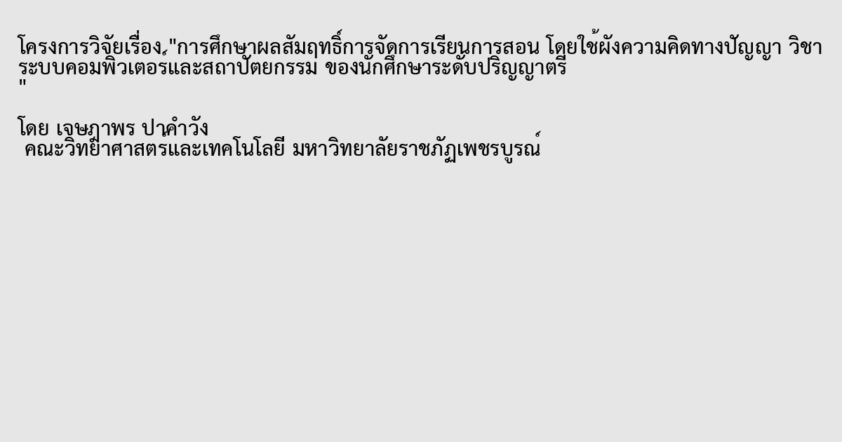 การวิจัยครั้งนี้มีวัตถุประสงค์เพื่อ 1) เปรียบเทียบผลสัมฤทธิ์ก่อนเรียนและหลังเรียน วิชาระบบคอมพิวเตอร์และสถาปัตยกรรม ที่จัดการเรียนการสอนโดยใช้ผังความคิดทางปัญญา (Mind Mapping) 2) ศึกษาความพึงพอใจต่อการจัดการเรียนการสอน วิชาระบบคอมพิวเตอร์และสถาปัตยกรรม โดยใช้ผังความคิดทางปัญญา(Mind Mapping) ประชากรและกลุ่มตัวอย่าง คือ นักศึกษาที่ลงทะเบียนในรายวิชาระบบคอมพิวเตอร์และสถาปัตยกรรม ภาคเรียนที่ 1 ปีการศึกษา 2558 จำนวน 28 คน เครื่องมือที่ใช้ในการดำเนินงานวิจัยแบบทดสอบวัดผลสัมฤทธิ์ทางการเรียน วิชาระบบคอมพิวเตอร์และสถาปัตยกรรม เป็นแบบทดสอบชนิดปรนัย จำนวน 40 ข้อ ชนิดเลือกตอบ 4 ตัวเลือก และแบบสอบถามความพึงพอใจที่มีต่อการเรียน โดยใช้คำถามแบบมาตราส่วนประมาณค่า (Rating Scale) ใช้วิธีการหาค่าเฉลี่ย และส่วนเบี่ยงเบนมาตรฐาน ผลการศึกษาผลสัมฤทธิ์ทางการเรียนการสอน ก่อนเรียน(Pretest) หลังเรียน(Posttest) ของกลุ่มตัวอย่างที่สอนโดยใช้แผนที่ความคิด(Mind Mapping) พบว่า นักศึกษาได้คะแนนความก้าวหน้าเฉลี่ยเท่ากับ 11.29 โดยมีค่าเฉลี่ยก่อนเรียนเท่ากับ 14.07 และค่าเฉลี่ยหลังเรียนเท่ากับ 25.36 เมื่อพิจารณาเป็นรายบุคคล พบว่า นักศึกษาได้คะแนนเพิ่มขึ้นทุกคน (คะแนนความก้าวหน้า) คือ ได้คะแนนเพิ่มขึ้นตั้งแต่ 7-17 คะแนน จากคะแนนเต็ม 40 คะแนน ผลการศึกษาความพึงพอใจของนักศึกษาที่มีต่อการเรียนการสอน โดยใช้ผังความคิดทางปัญญา วิชาระบบคอมพิวเตอร์และสถาปัตยกรรม พบว่า ผลการวิเคราะห์ผลสัมฤทธิ์การจัดการเรียนการสอน วิชาระบบคอมพิวเตอร์และสถาปัตยกรรม ของนักศึกษาระดับปริญญาตรี โดยใช้ผังความคิดทางปัญญา มีระดับความพึงพอใจอยู่ในระดับมาก ( =4.27, S.D.=0.63) พิจารณาเป็นรายข้อ พบว่า นักศึกษามีความพึงพอใจอยู่ในระดับ มากที่สุด 2 ประเด็น เรียงลำดับจากมากไปหาน้อย ดังนี้ ความพึงพอใจโดยรวมต่อการเรียนการสอน โดยใช้ผังความคิดทางปัญญา ( =4.86, S.D.=0.35) วิธีสอนนี้ทำให้นักศึกษาเข้าใจบทเรียนได้ดี ( =4.57, S.D.=0.56) ในส่วนความพึงพอใจระดับ มาก มี 7 ประเด็น คือ นักศึกษามีความรู้สึกว่าวิธีสอนนี้ช่วยให้ทำงานได้อย่างมีระบบและรอบคอบ ( =4.46, S.D.=0.50) วิธีสอนนี้ทำให้นักศึกษาแลกเปลี่ยนความคิดเห็นร่วมกันกับเพื่อน( =4.39, S.D.=0.49) วิธีสอนนี้ช่วยให้บรรยากาศในชั้นเรียนเป็นกันเอง( =4.32, S.D.=0.47)วิธีสอนนี้น่าสนใจทำให้นักศึกษาอยากเข้าเรียนและเข้าร่วมกิจกรรม( =4.29, S.D.=0.45)วิธีสอนนี้ช่วยให้นักศึกษาเรียนด้วยความสนุกสนาน( =4.21, S.D.=0.41) นักศึกษาต้องการเรียนด้วยวิธีสอนแบบนี้อีก ( =4.14, S.D.=0.35) วิธีสอนนี้ช่วยให้นักศึกษาเรียนอย่างมีความสุข ( =4.00, S.D.=0.76) ในส่วนความพึงพอใจระดับ ปานกลาง มี 1 ประเด็น ว