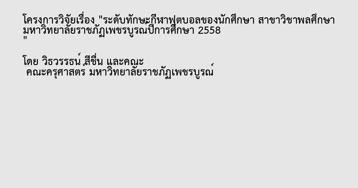 การวิจัยครั้งนี้มีจุดประสงค์เพื่อทราบระดับทักษะฟุตบอล ของนักศึกษาสาวิชาพลศึกษา ปีการศึกษา 2558 กลุ่มตัวอย่างเป็นนักศึกษาสาขาวิชาพลศึกษา ที่ผ่านการเรียนวิชาฟุตบอลมาแล้ว ได้มาโดยการสุ่มแบบง่ายด้วยวิธีการจับฉลาก เครื่องมือที่ใช้ในการวิจัย คือ แบบทดสอบทักษะฟุตบอลของ ณัฐวุฒิ ปล้องเจริญ การวิเคราะห์ข้อมูลโดยการหาค่าเฉลี่ยเลขคณิต ค่าเบี่ยงเบนมาตรฐาน ค่ามัธยฐาน ค่าฐานนิยม ค่าสูงสุด ค่าต่ำสุด และค่าคะแนนที