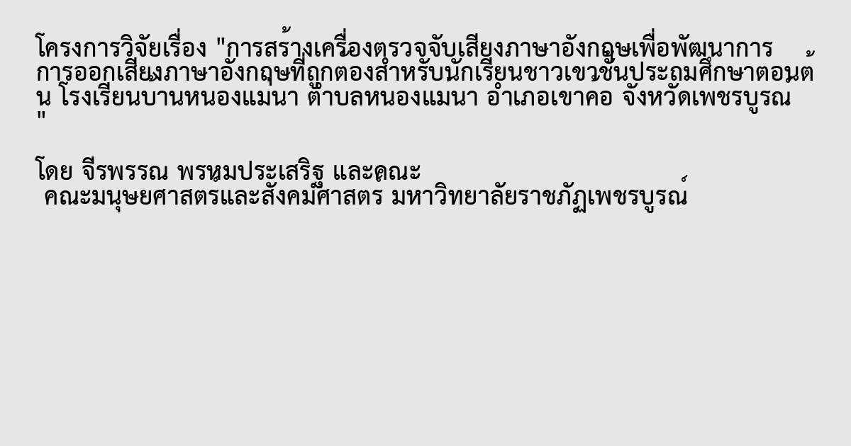 ชุดตรวจจับเสียงภาษาอังกฤษเพื่อการพัฒนาการ การออกเสียงภาษาอังกฤษที่ถูกต้องนี้ได้ถูกพัฒนาขึ้นด้วยระบบปฏิบัติการแอนดรอยด์ โดยผู้วิจัยได้พัฒนา แอพพลิเคชั่นแอนดรอยด์ Detect Me English เพื่อใช้สำหรับประมวลผลการเปล่งเสียงคำศัพท์ภาษาอังกฤษ เหมาะสำหรับนักเรียนระดับชั้นประถมศึกษาตอนต้น การวิจัยครั้งนี้ มีจุดประสงค์เพื่อศึกษาการพัฒนาการ การออกเสียงภาษาอังกฤษที่ถูกต้องสำหรับนักเรียนระดับประถมศึกษาตอนต้น การศึกษาการวิจัยมี 3 ช่วง คือ ช่วงที่ 1 สำรวจข้อมูลพื้นฐานและศึกษาความต้องการในการพัฒนาการออกเสียงคำศัพท์ภาษาอังกฤษที่ถูกต้องสำหรับนักเรียนชั้นประถมศึกษาตอนต้น ช่วงที่ 2 สัมภาษณ์กำหนดรูปแบบคำศัพท์จำนวน 10 คำศัพท์สำหรับนักเรียนระดับชั้นประถมศึกษาตอนต้น ช่วงที่ 3 ทดสอบการเปล่งเสียงด้วยชุดตรวจจับเสียงภาษาอังกฤษที่ถูกต้องสำหรับนักเรียนชั้นประถมศึกษาตอนต้น ศึกษาผลการพัฒนาและการมีส่วนร่วม ประชากรที่ใช้ในการวิจัย คือ นักเรียนระดับช่วงชั้นประถมศึกษาตอนต้น โรงเรียนบ้านหนองแม่นาตำบลหนองแม่นา อำเภอเขาค้อ จังหวัดเพชรบูรณ์ จำนวน 20 คน เครื่องมือที่ใช้ในการทดลอง 1) สำรวจความต้องการชุดตรวจจับเสียงภาษาอังกฤษเพื่อพัฒนาการ การออกเสียงภาษาอังกฤษที่ถูกต้องสำหรับนักเรียนชั้นประถมศึกษาตอนต้น 2) แบบสอบถามสัมภาษณ์คุณครูผู้สอนวิชาภาษาอังกฤษ ระดับประถมศึกษาตอนต้น 3) ชุดตรวจจับเสียงภาษาอังกฤษเพื่อพัฒนาการ การออกเสียงภาษาอังกฤษที่ถูกต้องสำหรับนักเรียนชั้นประถมศึกษาตอนต้น 4) แบบทดสอบการอ่านออกเสียงภาษาอังกฤษที่ถูกต้อง โดยให้ผู้ทดสอบ ทดสอบการอ่าน 3 ครั้ง ต่อ 1 คำศัพท์ เพื่อวัดผลรูปแบบเปอร์เซ็น ผลการศึกษาพบว่า นักเรียนระดับช่วงชั้นประถมศึกษาตอนต้น ได้รับการทดลองการอ่านคำศัพท์ภาษาอังกฤษจากชุดตรวจจับเสียงภาษาอังกฤษ ซึ่งมีพัฒนาการ การอ่านคำศัพท์ที่ดีขึ้น ระดับ 80.33% มีระดับความพึงพอใจระดับมาก จากผลการศึกษาข้างต้นนี้จึงชี้ให้เห็นถึงศักยภาพ ชุดตรวจจับเสียงภาษาอังกฤษเพื่อพัฒนาการ การออกเสียงภาษาอังกฤษที่ถูกต้อง สามารถทำให้นักเรียนระดับประถมศึกษาตอนต้นให้ความสนใจเรียนรู้การอ่านคำศัพท์ภาษาอังกฤษในแนวโน้มที่ดีขึ้นจากการอ่านด้วยตนเอง คำสำคัญ : ชุดตรวจจับเสียงภาษาอังกฤษ, การออกเสียงภาษาอังกฤษ, นักเรียนชาวเขาชั้นประถมศึกษาตอนต้น