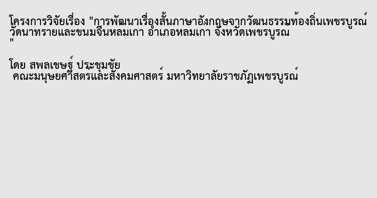 This paper aimed to construct English short stories composed of Phetchabun folk culture, determine their effectiveness by the criterion standard 70/70, compare learning achievement results between the pretest and posttest, and evaluate students’ satisfaction of the constructed instruction. The sample used in the study, by purposive sampling, was 20 students of the 3rd secondary grade in semester 2 academic 2015 at Srimongkol Municipal School, Lomsak district, Phetchabun province. The research instruments included 2 English short stories with exercises composed of Phetchabun folk culture, pre-and-post achievement tests, and a satisfaction questionnaire. The statistics used to analyze data were percentage, mean, stand derivation, an analysis of effectiveness value E1 / E2, and difference comparison by t-test.