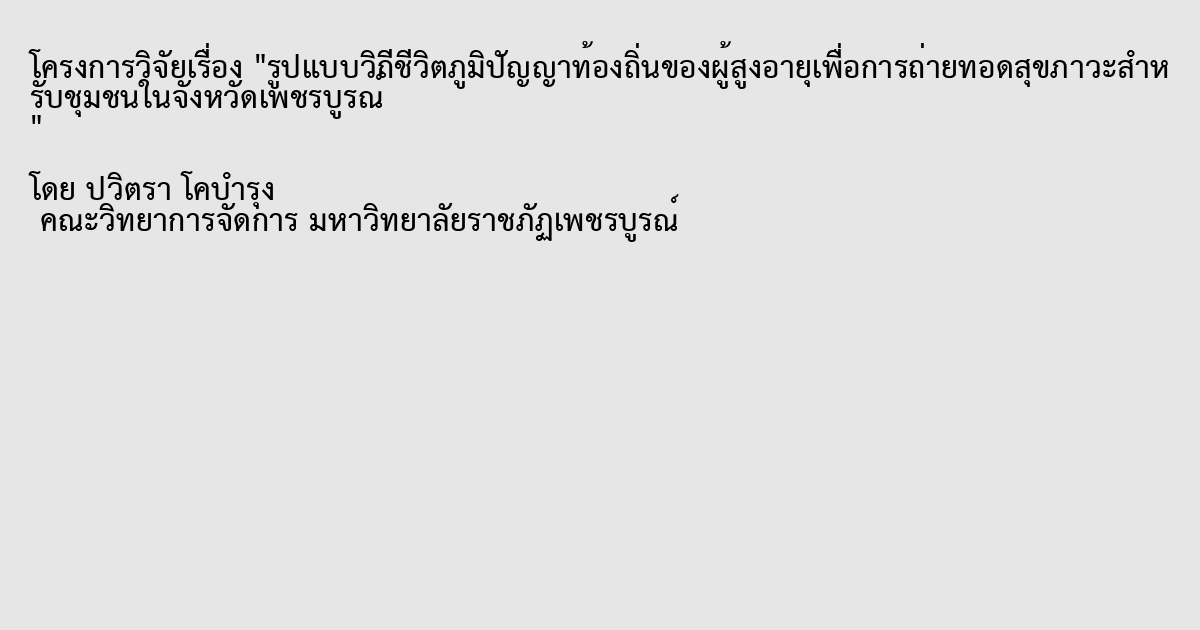 รูปแบบวิถีชีวิตภูมิปัญญาท้องถิ่นของผู้สูงอายุเพื่อการถ่ายทอดสุขภาวะสำหรับชุมชนในจังหวัดเพชรบูรณ์