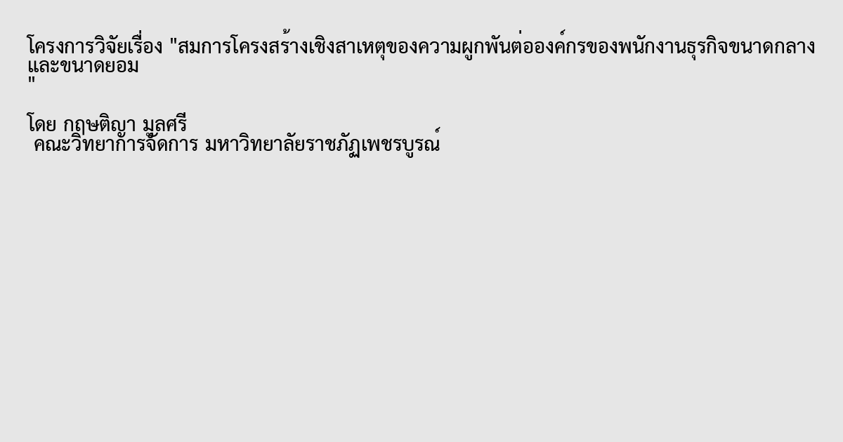 The purpose of this research was to 1) study level of job satisfaction and organizational commitment of the small and medium sized businesses (SME) employee 2) Empirical tests of the structural causes of the organizational commitment of the small and medium sized businesses (SME) employee 3) Guidelines have job satisfaction and organizational commitment of the small and medium sized businesses (SME) employee. The sampling group was the 550 SME