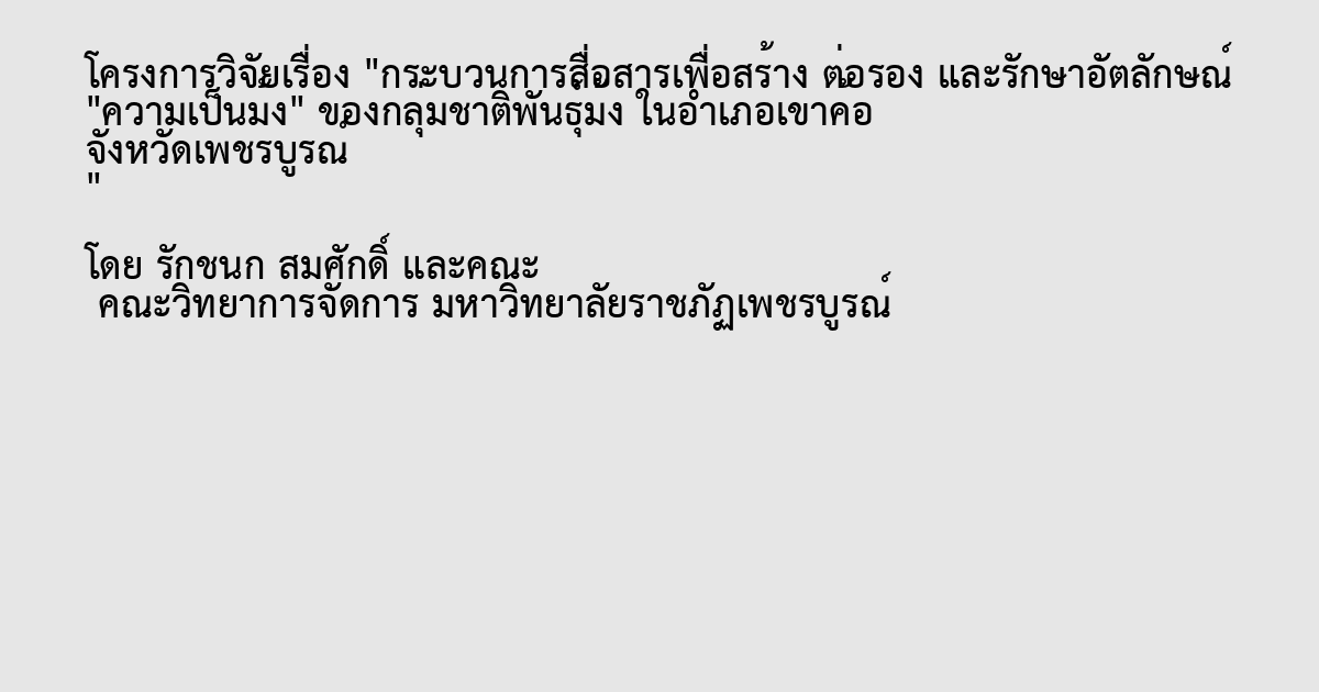 งานวิจัยนี้นำเสนอกระบวนการสื่อสารเพื่อสร้าง ต่อรอง และรักษาอัตลักษณ์ “ความเป็นม้ง” ของกลุ่มชาติพันธ์ม้งในอำเภอเขาค้อ จังหวัดเพชรบูรณ์ โดยมีวัตถุประสงค์ 4 ประการ ได้แก่ 1)เพื่อศึกษาบริบททางวัฒนธรรมของกลุ่มชาติพันธุ์ม้งในอำเภอเขาค้อ จังหวัดเพชรบูรณ์ 2)เพื่อการวิเคราะห์การสื่อสารเพื่อสร้าง ต่อรอง และรักษาอัตลักษณ์ “ความเป็นม้ง” ของกลุ่มชาติพันธ์ม้งในอำเภอเขาค้อ จังหวัดเพชรบูรณ์ 3)เพื่อศึกษาวิเคราะห์ปัจจัยที่มีผลต่อการสร้าง ต่อรอง และรักษาอัตลักษณ์ “ความเป็นม้ง” ของกลุ่มชาติพันธ์ม้งในอำเภอเขาค้อ จังหวัดเพชรบูรณ์ 4)เพื่อศึกษาการรับรู้ความหมายและคุณค่าเกี่ยวกับอัตลักษณ์“ความเป็นม้ง” ของกลุ่มชาติพันธ์ม้งเองและของคนอื่น